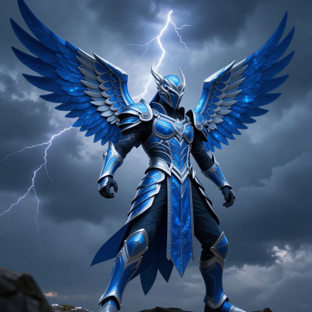 Photograph of a powerful, blue-armored angelic warrior standing against a stormy, lightning-filled sky. The warrior has large, vivid blue wings with detailed feather textures, and wears shiny, metallic blue armor with intricate designs. Lightning bolts illuminate the dark, cloud-filled background, enhancing the dramatic atmosphere. The warrior's helmet has a pointed crest, and its fists are clenched in a strong, commanding stance. The overall color scheme is dominated by shades of blue and metallic hues, giving the image a surreal and majestic feel. The photograph emphasizes the warrior's strength and divine presence.