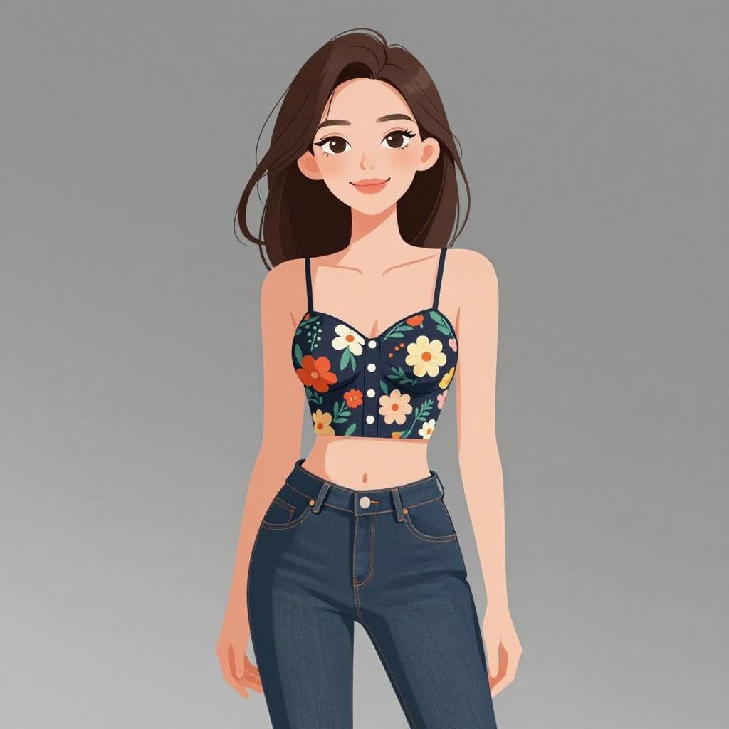 Woman with pretty face and pretty hair. smiling Woman, casual contemporary, sleeveless tank top in charcoal grey with abstract print in red and orange hues, round neckline, relaxed fit, light distressing around edges, paired with light blue denim jeans with a subtle faded wash, front whiskering, classic five-pocket styling, straight leg cut, gray studio background --sref 1467