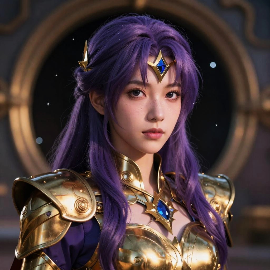 (8k, RAW photo, best quality, masterpiece:1.2), (realistic, photo-realistic:1.37), (upper body:1.4), highly detailed eyes, photo of beautiful 1girl, masterpiece, super detailed, gold armor, armor, looking at viewer, shoulder armor, (purple hair:1.6), black eyes, highly detailed hair, Golden Armor, in front of void portal, shoulder_armor decoration, visible lips, forehead protector, forehead armor, forehead jewel, bokeh, (facial freckles:0.01), dawn, low light, stars in the background