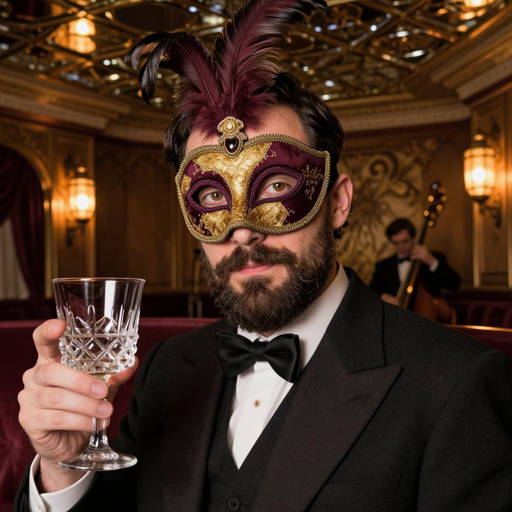 Bearded man in black tuxedo and gold masquerade mask with purple feather, holding crystal glass, in ornate, dimly-lit