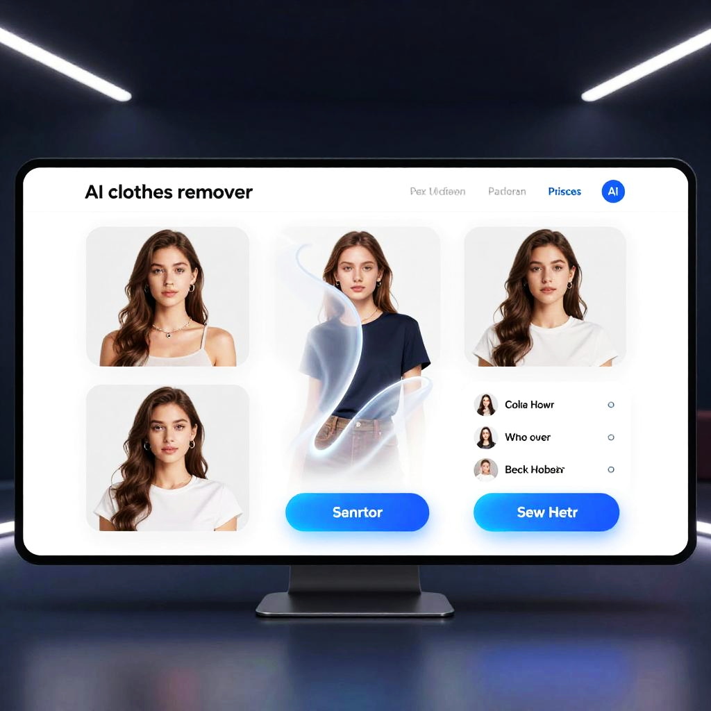 AI clothes remover website dashboard, clean, futuristic design with interactive avatars, digital clothes peeling effect, glowing UI buttons, neon lighting, sophisticated AI fashion technology, seamless digital transformation, high-resolution graphics with smooth transitions