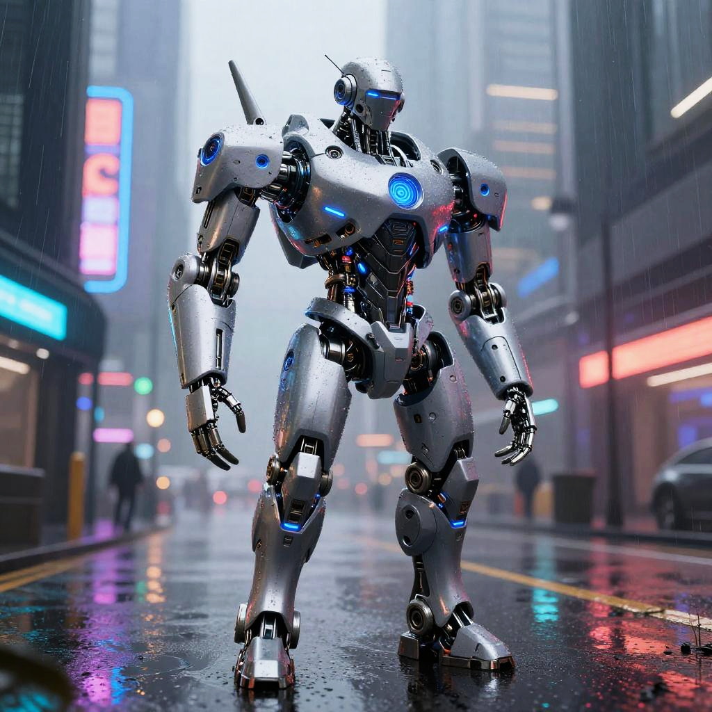 Aak, a futuristic robotic creature blending organic and mechanical elements, sleek metallic surfaces with glowing blue accents, standing in a neon-lit cyberpunk city, rain reflecting colorful lights on wet pavement, highly detailed sci-fi scene