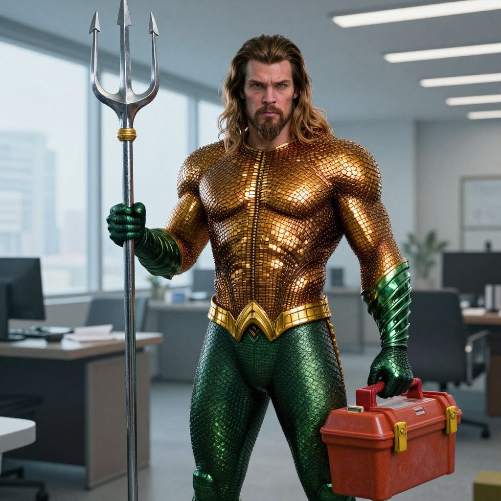 Luxurious The superhero Aquaman goes to work in an office building in the morning. He has a trident in one hand and a toolbox in the other,