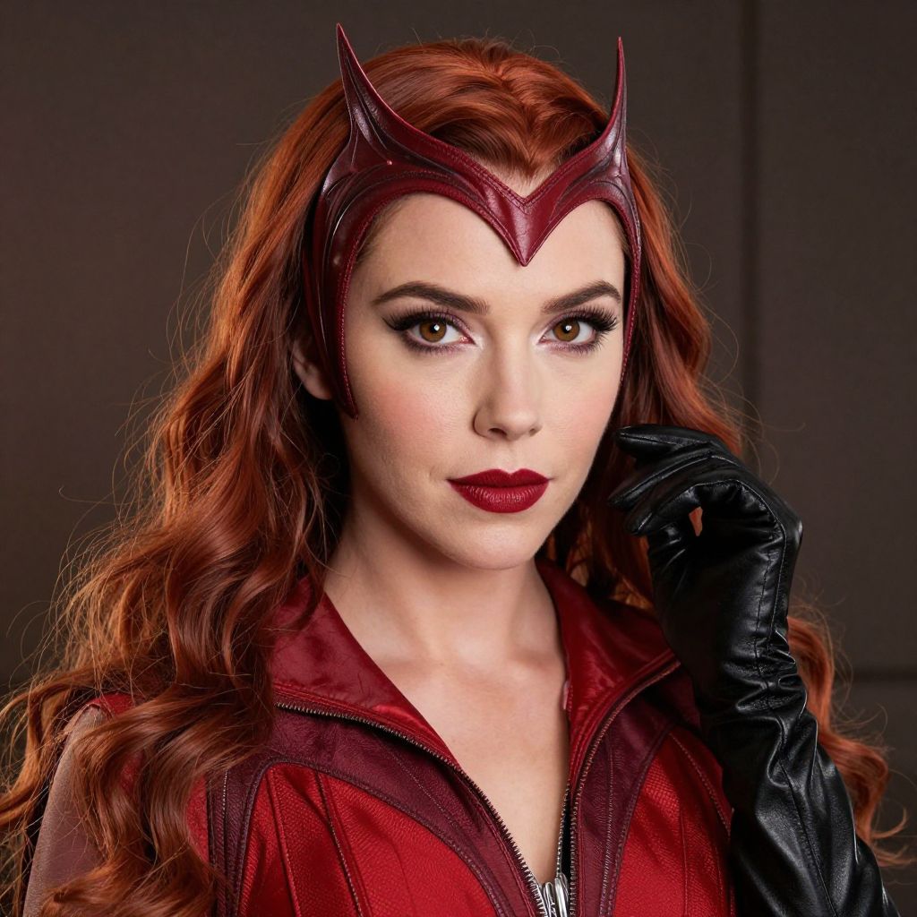 Photograph of a young woman with fair skin and long, wavy red hair, dressed as a superhero. She wears a red, form-fitting costume with a high collar and black leather gloves. Her head is adorned with a maroon, horned headpiece. She has dark, smoky eye makeup and bold red lipstick. Her expression is serious and focused. The background is dark and blurred, emphasizing her costume and face. The image has a high-contrast, dramatic lighting style, highlighting her features and costume details. The photograph has a slightly surreal, CGI-enhanced quality.