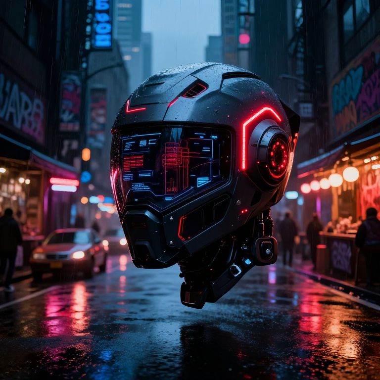 Cyberpunk helmet featuring a sleek angular design, pulsing red LED accents, integrated HUD display, reflected in rain-soaked streets filled with flying cars and bustling neon-lit market stalls, with a dark urban alley background full of graffiti and cybernetic enhancements.
