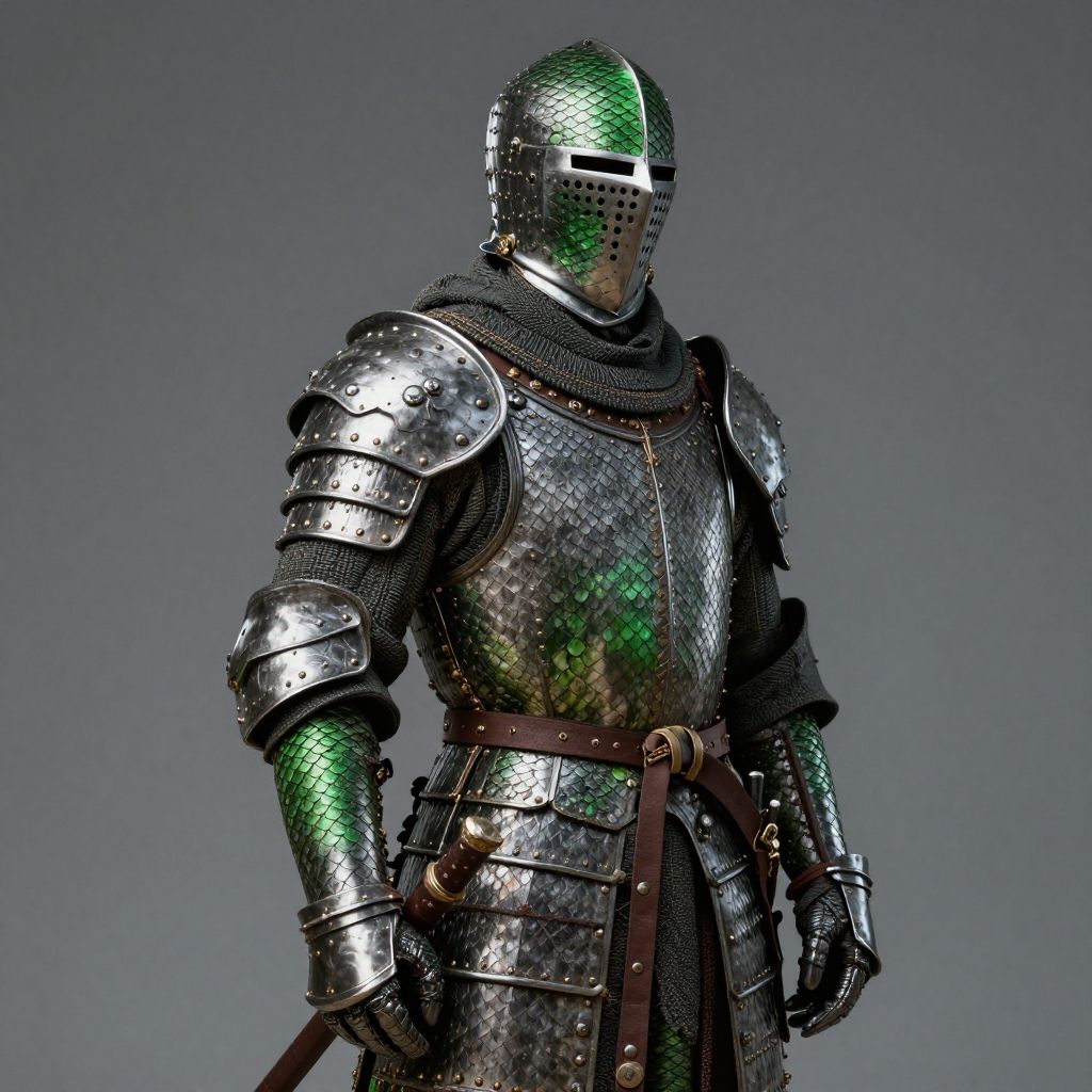 Photorealistic CGI of a medieval knight in shimmering silver armor with green highlights, wearing a green-misted visor and brown belt.