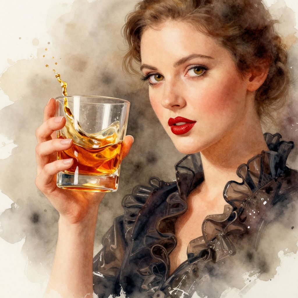 The image is a striking digital watercolor painting of a beautiful woman holding a glass of whiskey. The woman's face is detailed with soft, realistic brushstrokes, showcasing her elegant features and vibrant red lipstick. She is dressed in a dark, elegant outfit with a ruffled neckline, adding a touch of sophistication to her appearance. The glass of whiskey she holds is filled with a golden liquid, with a splash of amber-colored liquid cascading down its side, creating a dynamic and visually appealing effect. The background is a blend of warm, earthy tones, with splashes of paint adding depth and texture to the scene. The overall composition is balanced, with the woman's face and the glass of whiskey being the focal points, drawing the viewer's attention to the intricate details and the interplay of colors and textures.