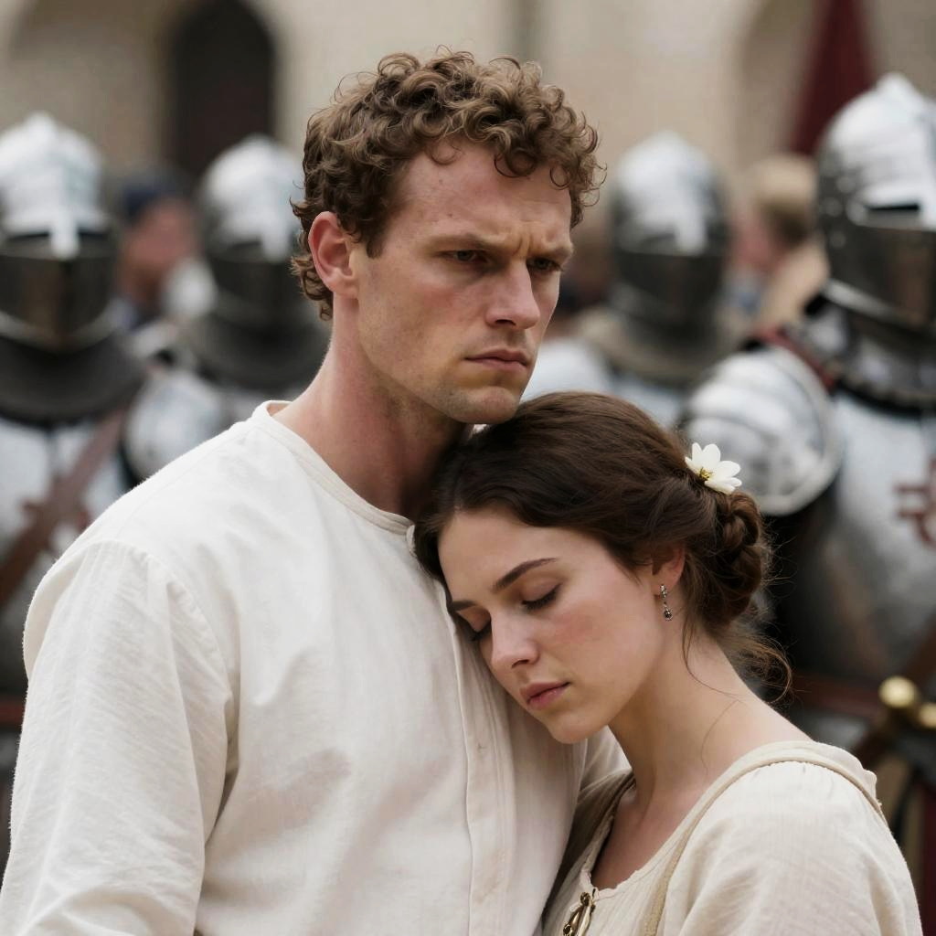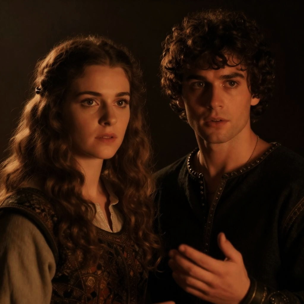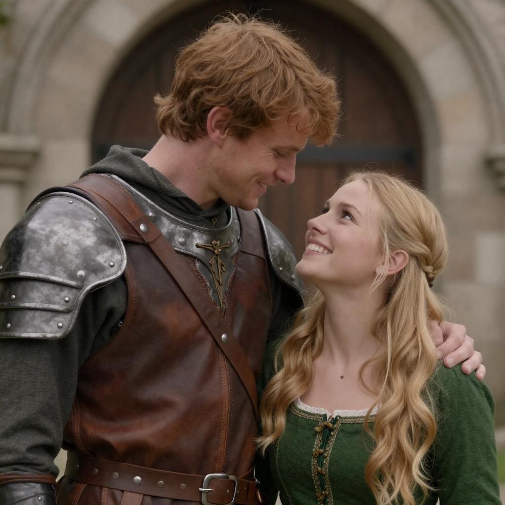 Photograph of a man and woman in medieval-style clothing. Man with reddish-brown hair, leather armor with silver trim, leans close to smiling woman with blonde hair, wearing green dress. Stone archway and wooden door in background. Man looks down, woman looks up. Warm lighting. Casual, intimate interaction.