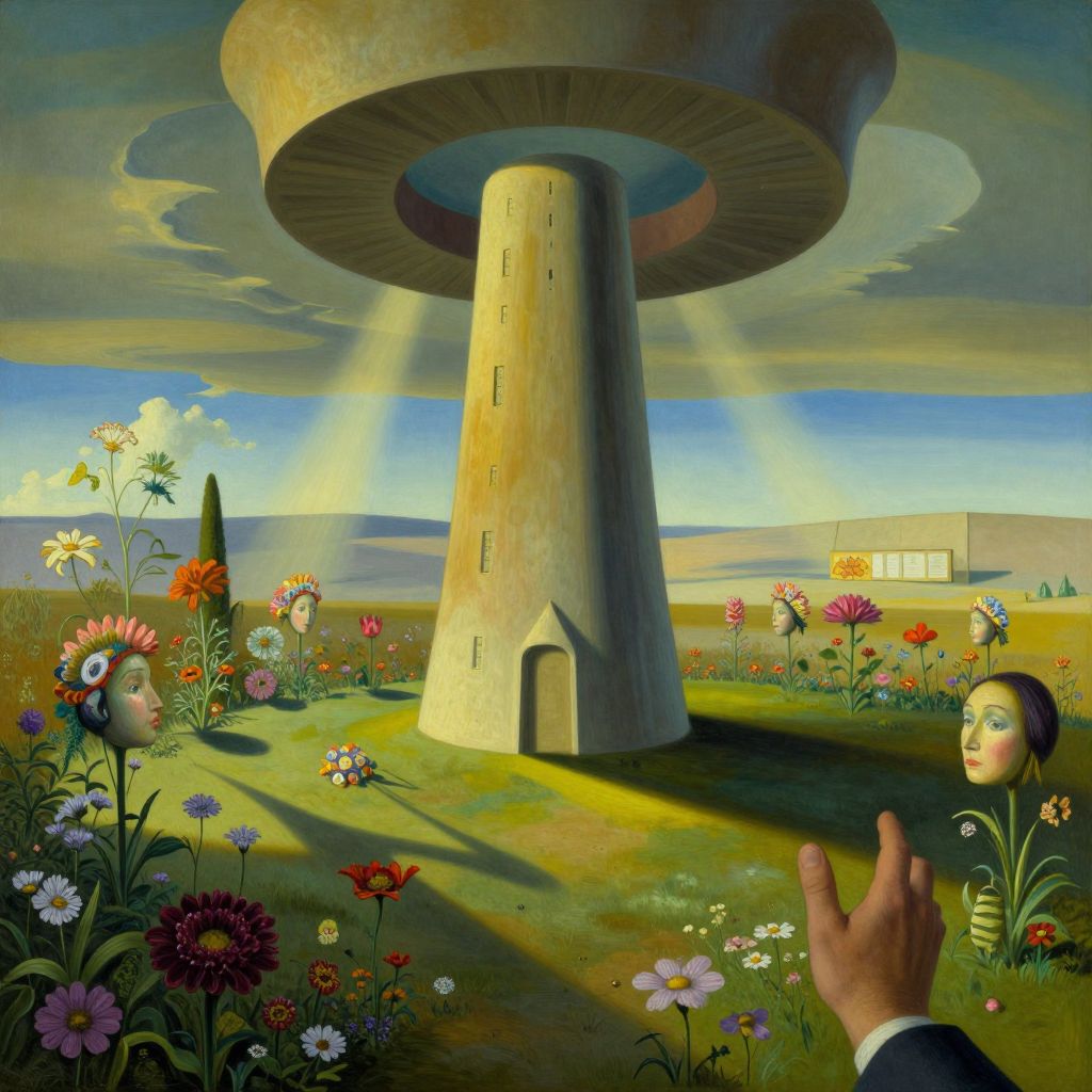 Craft an image in the surrealistic style reminiscent of Dali's paintings, illustrating a dreamlike scene with a colossal tower dominating a tranquil garden adorned with peculiar flowers resembling human visages, as viewed from a first-person angle beneath its imposing presence. The setting should inspire both wonder and intrigue as sunlight pierces through the ethereal landscape, casting elongated shadows that distort familiar elements in an unsettling yet mesmerizing manner, establishing an atmosphere at once captivating and disconcerting for the observer.