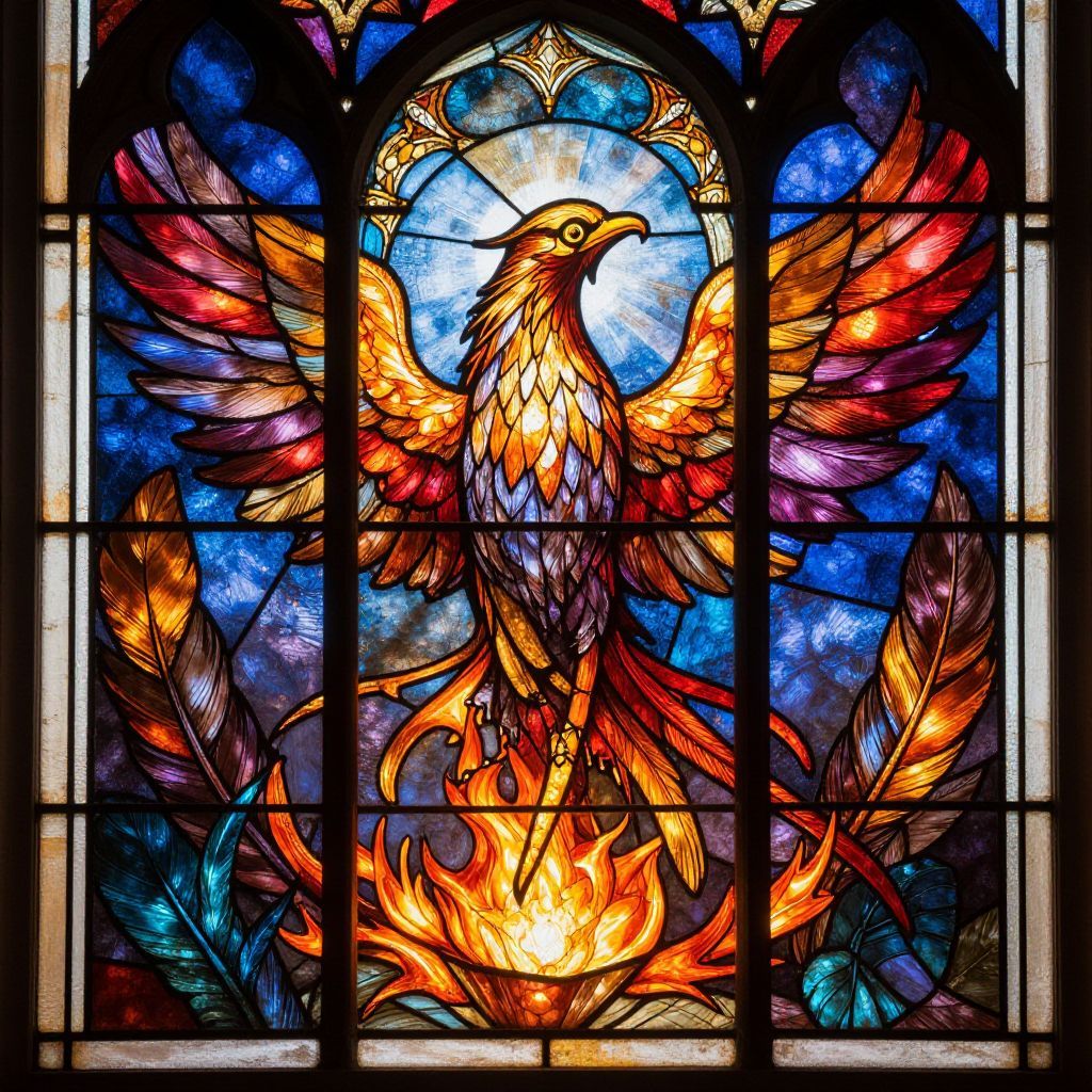 Phoenix stained glass pattern, vibrant colors, intricate details, glowing embers, luminous light filtering through fiery feathers, gothic window style, elegant and mystical ambiance
