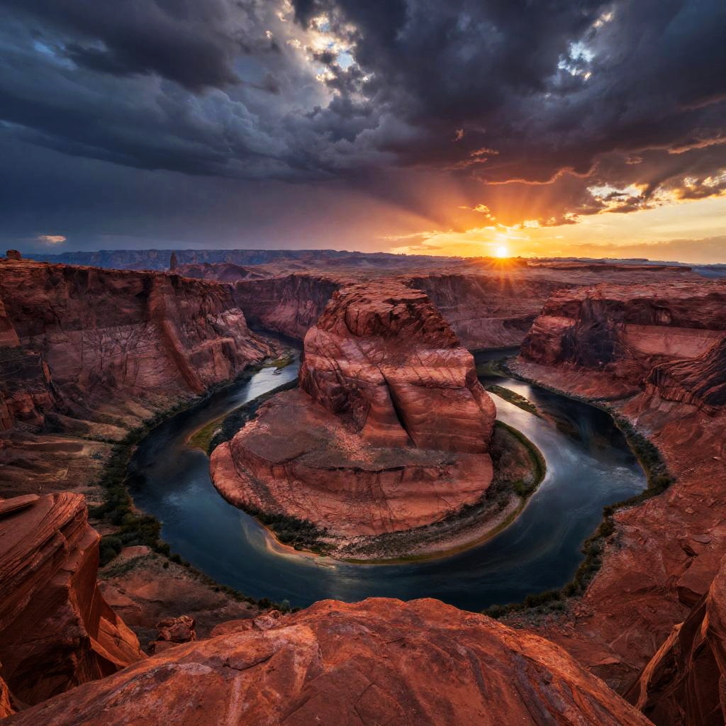 Awe inspiring landscapes of vast desert canyons under a dramatic stormy sky, rich textures of red rock formations, detailed shadows, and a winding river reflecting the fiery sunset, cinematic lighting