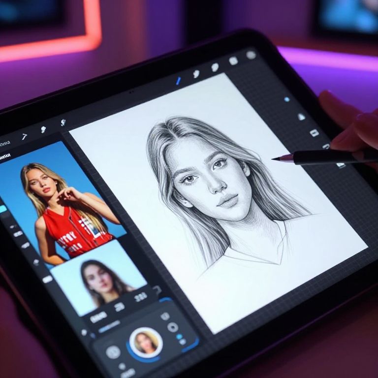 Close-up of a tablet showcasing apps that turn pictures into drawings, highlighting the transformation of a vibrant photo into a detailed pencil sketch, with digital art interface elements and glowing effects in a modern studio environment.