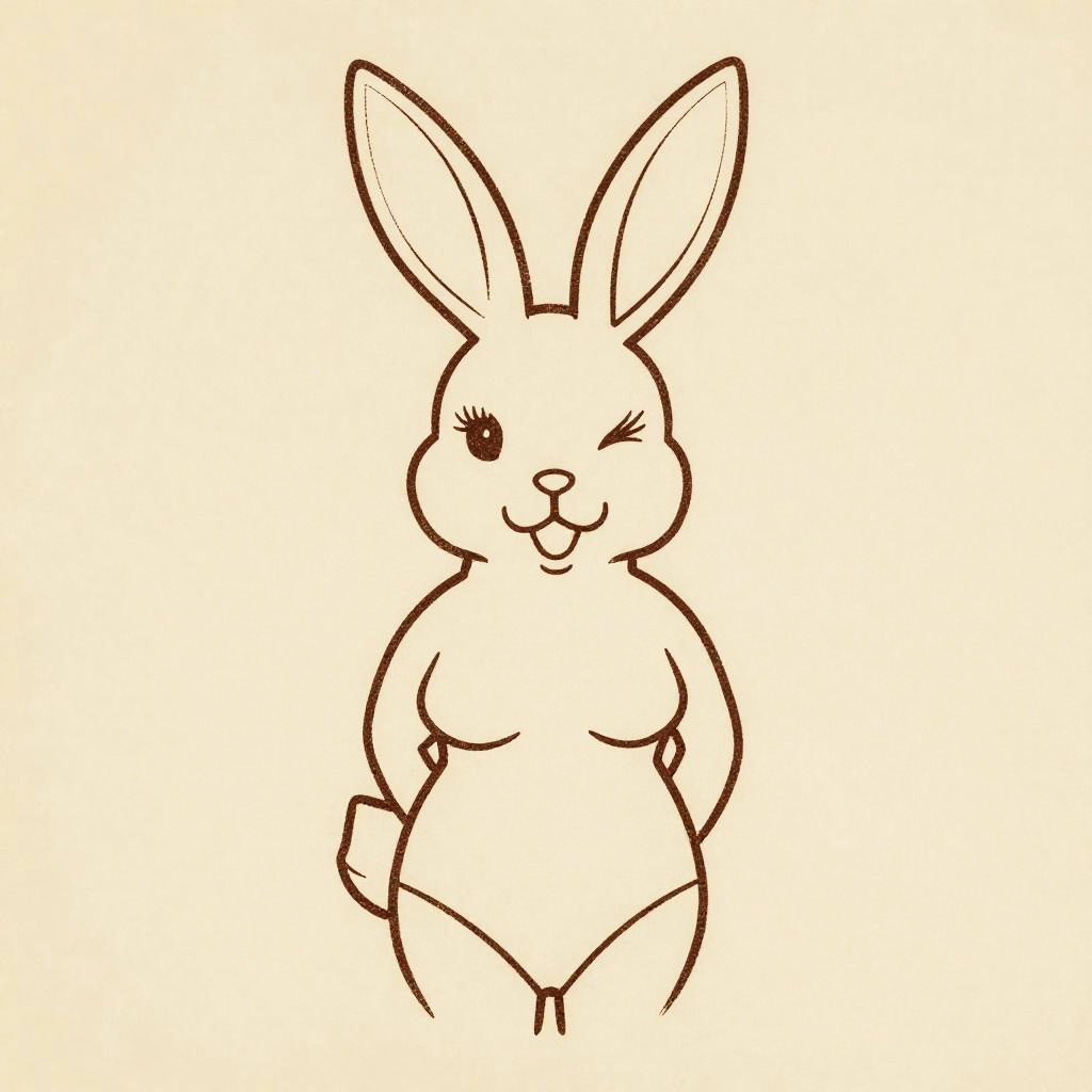 Playboy bunny outline, vintage hand-drawn style with slightly rough textured lines, warm sepia tone background, nostalgic and classic feel, elegant and timeless illustration, fine line work emphasizing simplicity and charm