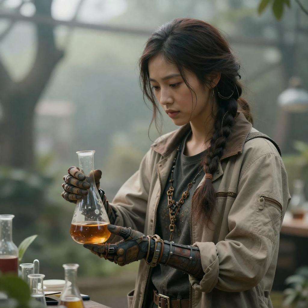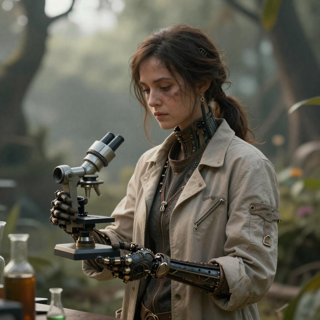 Post-apocalyptic botanist of hope, intricately detailed and hyper-realistic, with vibrant color enhancement and exceptional sharpness, creating a breathtaking composition, award-winning, ultra-high definition.