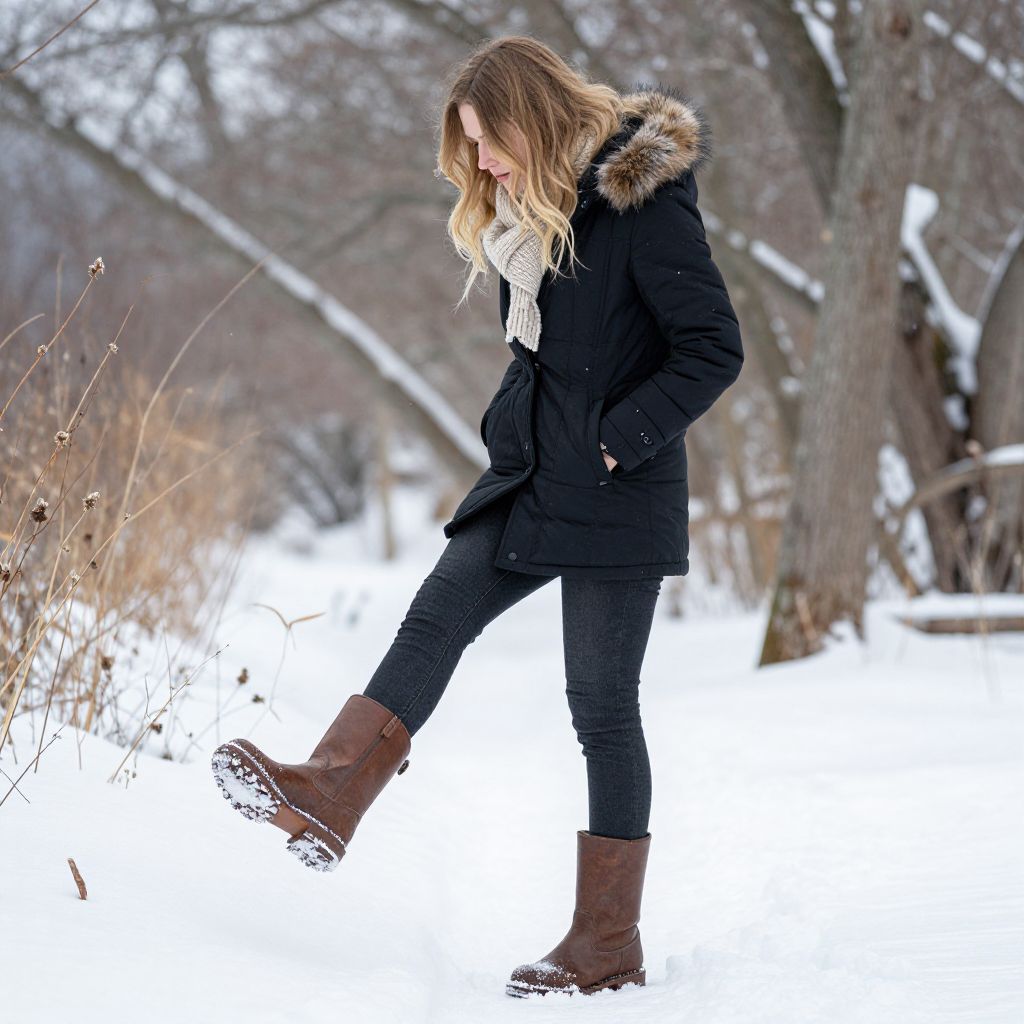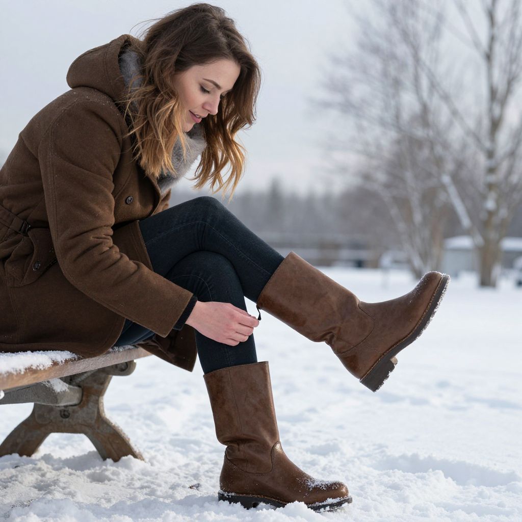 Woman Gazing at Boots in Snow
