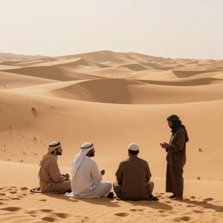In the vast expanse of the desert, four figures stand in quiet communion, their voices weaving threads of creation amidst the golden sands, where the air hums with the promise of life and the echoes of ancient wisdom reply in whispers of tangible poetry.