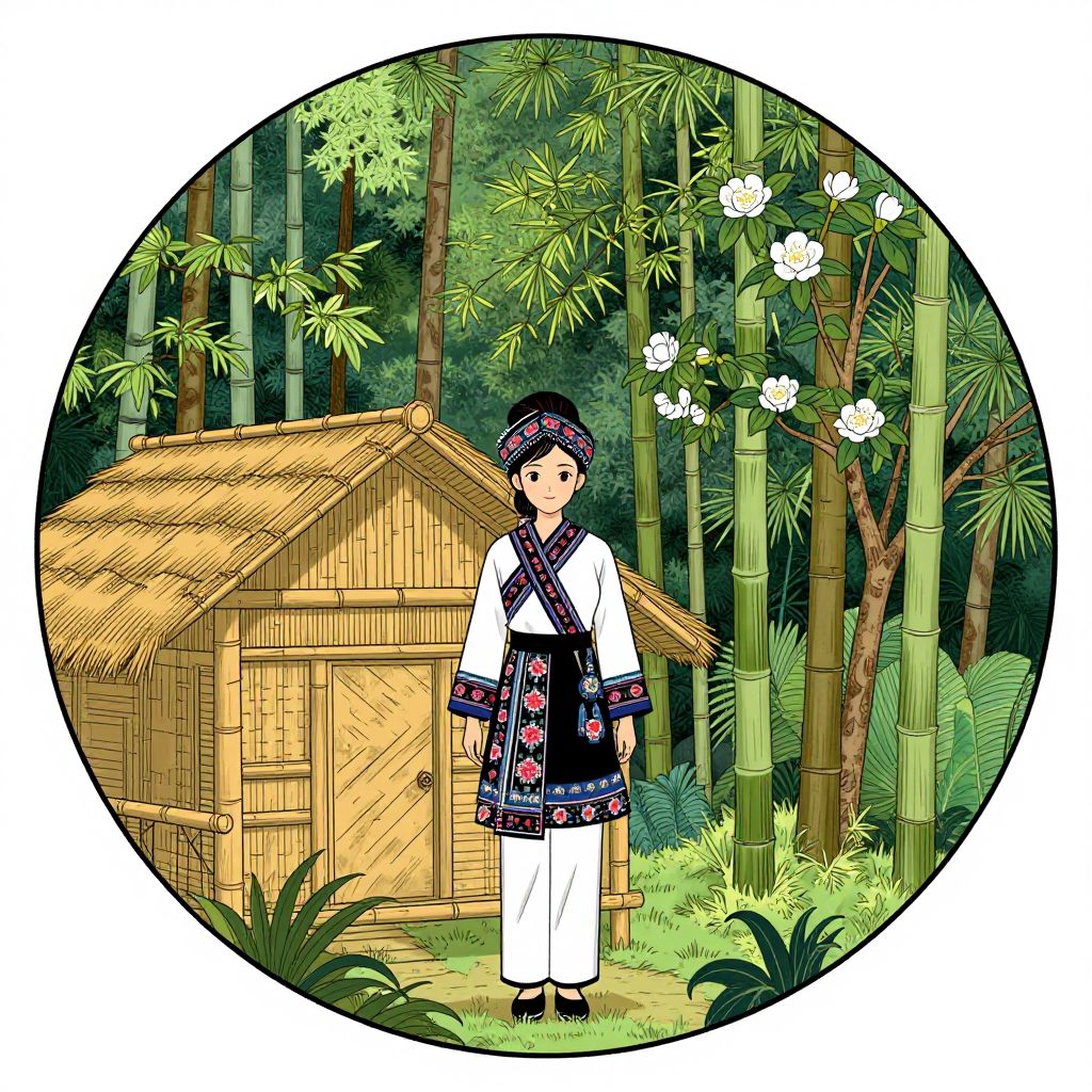 The image is a detailed line drawing of a Yunnan Dai Minority beautiful young woman, resembling Li Qin, in a traditional Dai Minority outfit, standing in front of a bamboo house amidst an ancient forest of camellia sinensis trees. The woman is depicted with intricate hair styling and a serene expression, wearing a long-sleeved dress adorned with floral patterns. The bamboo house, characterized by its thatched roof and wooden structure, is situated to the left of the woman, partially obscured by the lush greenery of the forest. The forest itself is dense with various types of trees and plants, including tall bamboo stalks and camellia sinensis trees, creating a rich, natural backdrop. The entire scene is framed within a thin, circular border, emphasizing the central figure and the surrounding environment. The overall composition is balanced, with the woman positioned centrally, and the bamboo house and forest elements arranged symmetrically around her, creating a harmonious and visually appealing arrangement.