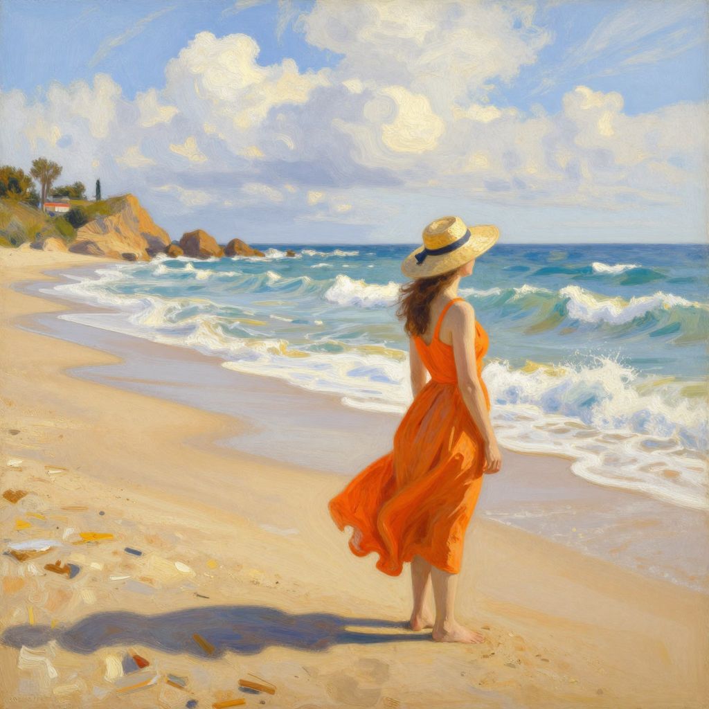 A serene beach scene rendered in a painterly style reminiscent of Joaquín Sorolla, featuring a woman in an orange dress and straw hat standing on a sandy shore, with vibrant waves crashing against the coastline under a bright, cloud-dotted sky, capturing the essence of golden-hour lighting and impressionistic detail.