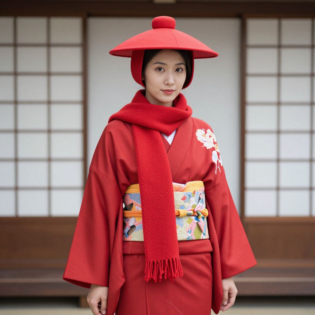 Photograph of an Asian woman standing indoors, wearing a bright red traditional Japanese kimono with wide sleeves. She has a red, dome-shaped hat with a small knob on top. A red, textured scarf is draped around her neck, and a colorful, patterned obi (sash) is tied at her waist. She has fair skin, black hair partially visible under the hat, and is looking directly at the camera with a neutral expression. The background features traditional Japanese shoji screens with white paper and wooden frames. The overall image has a vibrant, traditional aesthetic.