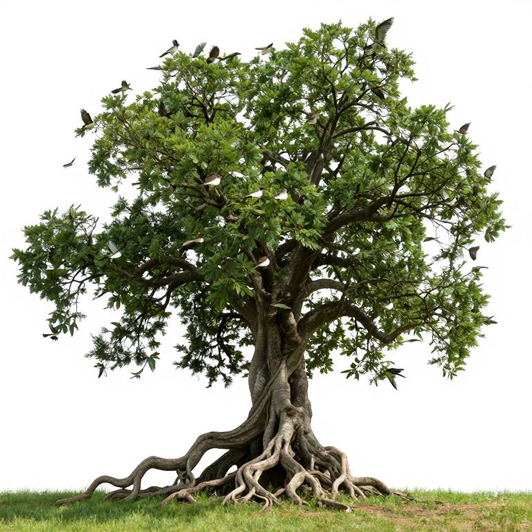A gnarled, ancient tree with twisting roots and lush foliage becomes a surreal haven for a flock of birds that seem to emerge directly from its branches, defying gravity as they swirl and flutter in perfect harmony with the tree’s organic form.