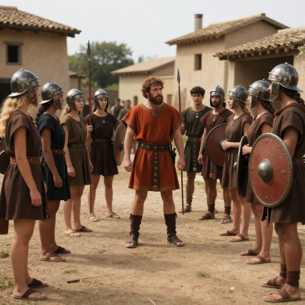 Photograph of a Roman-style village scene. A bearded man in an orange tunic and black boots stands facing a line of women and men in brown tunics and helmets. Women have blonde hair, men have short dark hair. Village buildings in background. Men hold shields and spears. Women hold small shields. Dirt ground, rustic setting. Intense facial expressions on bearded man and women. Group stands in semi-circle around him. Several onlookers in background.