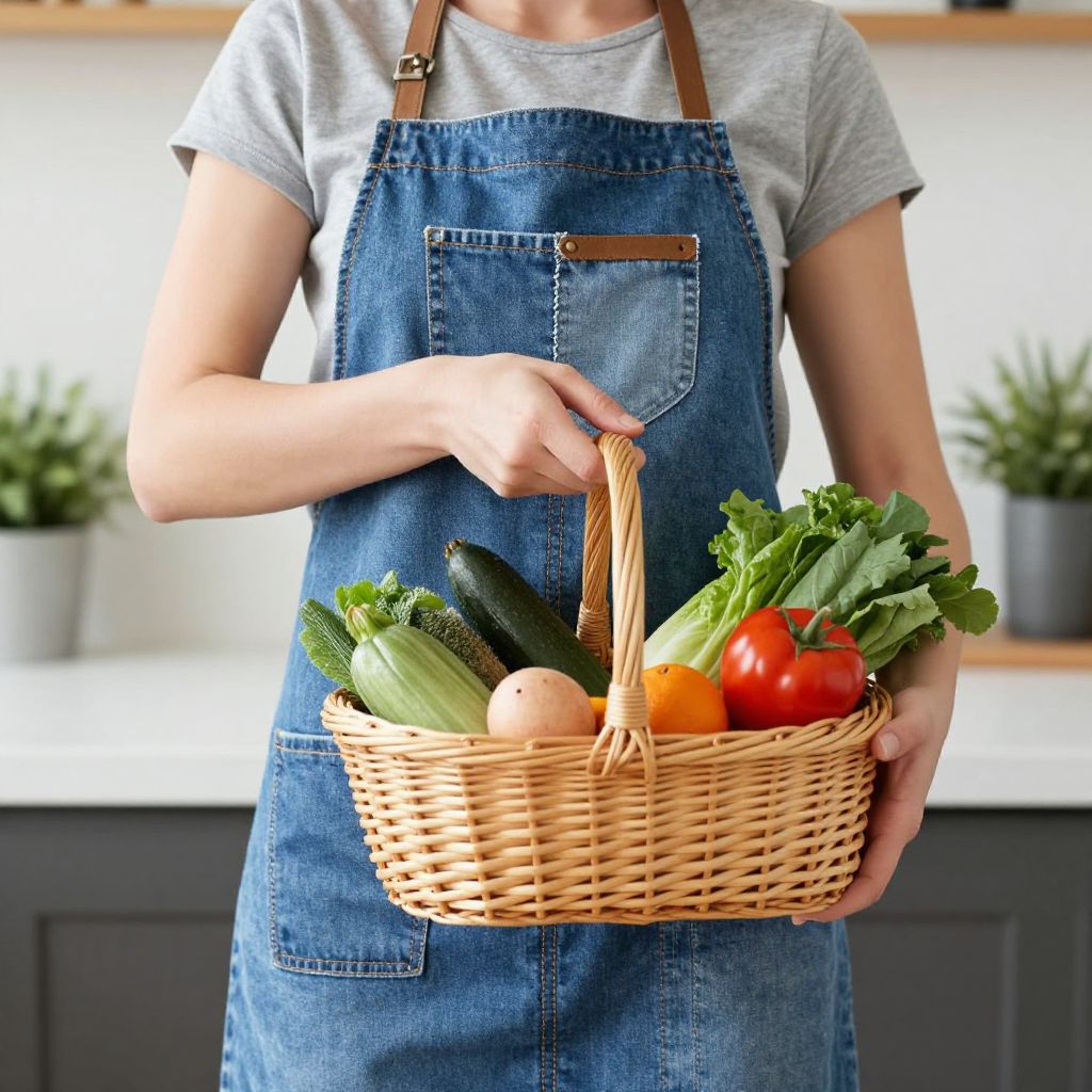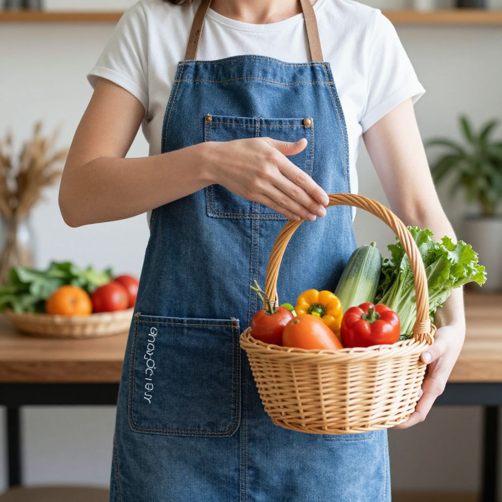Woman wearing a denim apron crafted from recycled jeans holds a wicker basket filled with fresh produce, demonstrating a creative upcycling tutorial from Creative Green Living.