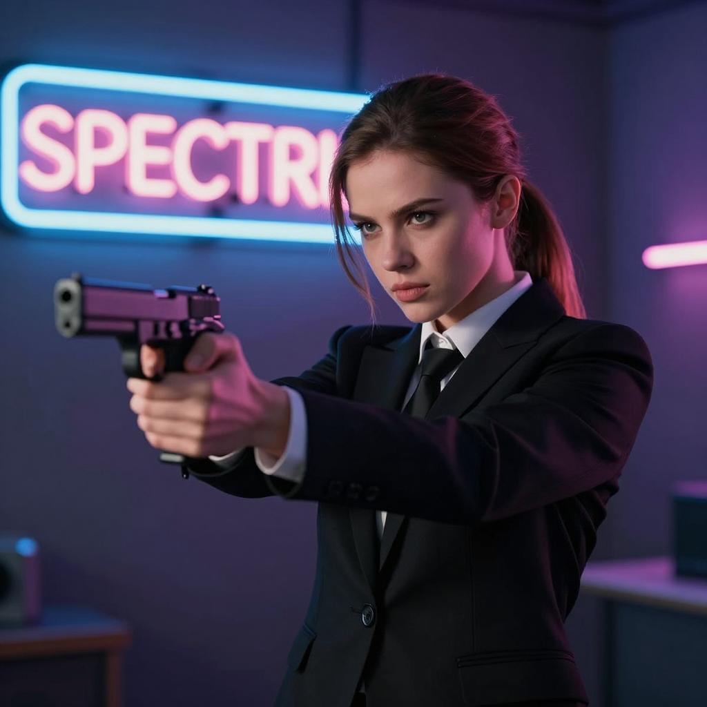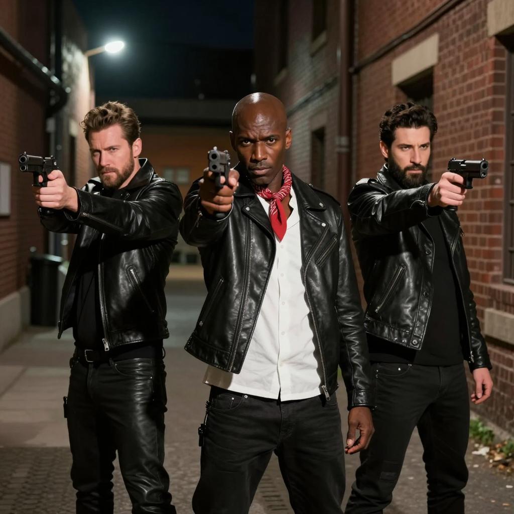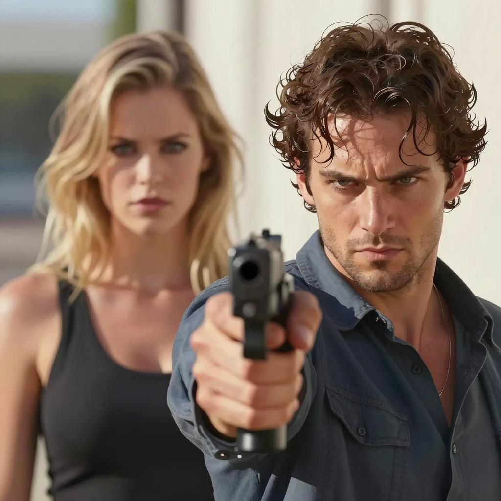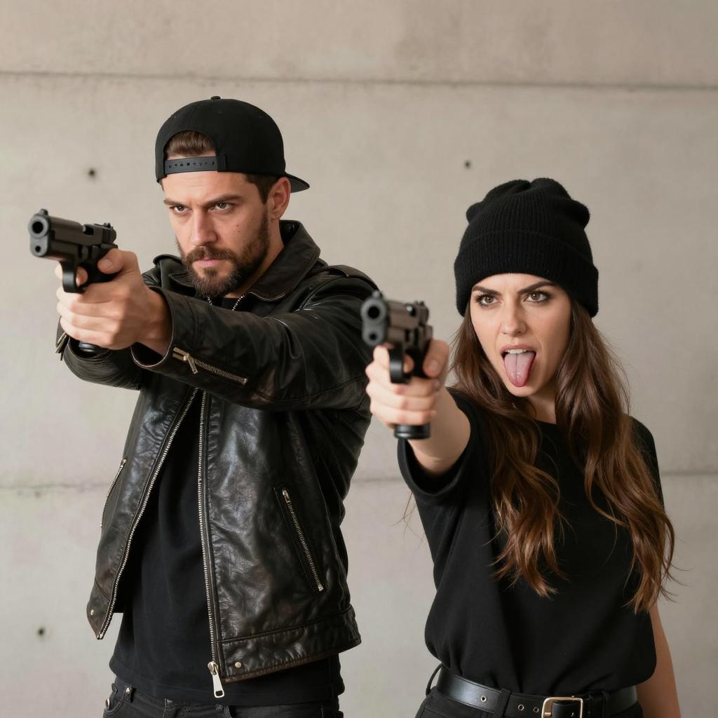 Portrait of a young man and woman aiming guns forward. The man wears a black leather jacket, black shirt, and black backward baseball cap with a beard and mustache. The woman has long brown hair, a black beanie, and a black shirt, sticking her tongue out. Both have intense expressions, standing against a beige concrete wall background.