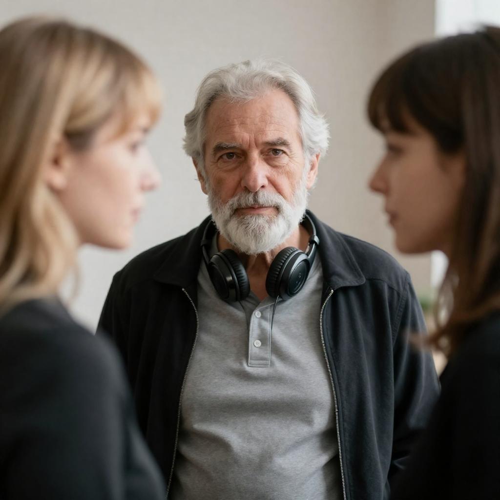 Photograph of an elderly man with a white beard and grey hair, wearing a grey polo shirt and black jacket with headphones around his neck, looking intently at two women. The woman on the left has blonde hair, slightly out of focus, while the woman on the right has brown hair and bangs, also slightly out of focus. Warm indoor lighting.