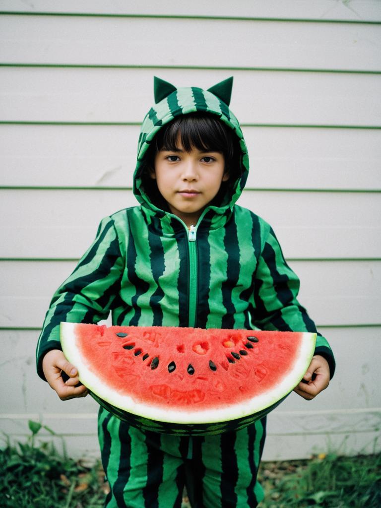 Man in Kid Watermelon costume, photorealistic cosplay editorial portrait