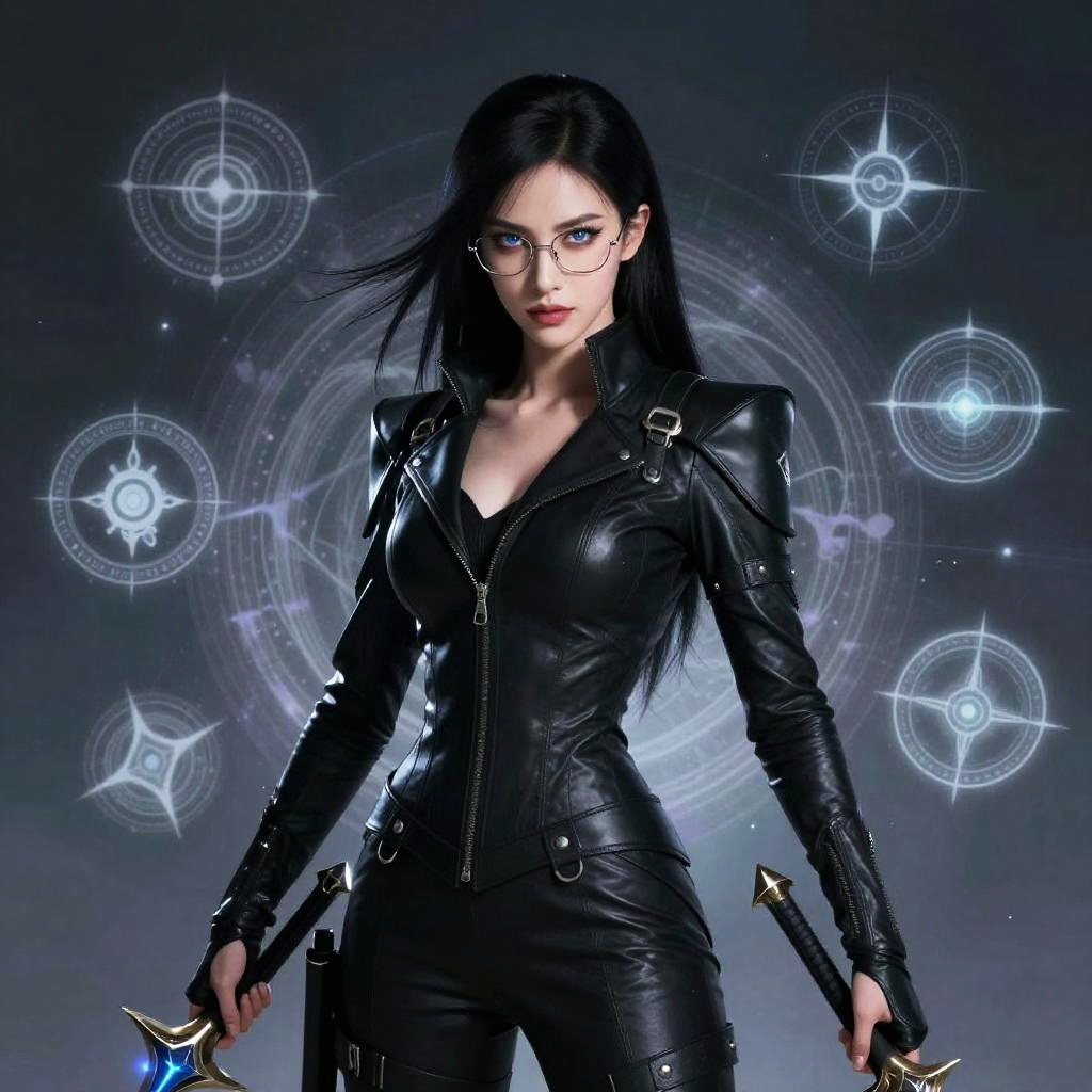 Bayonetta images portrait, confident female warrior with sharp glasses and sleek black costume, eyes glowing subtly, holding magical weapons, surrounded by abstract magical symbols and floating runes, sharp focus, ethereal and mysterious mood
