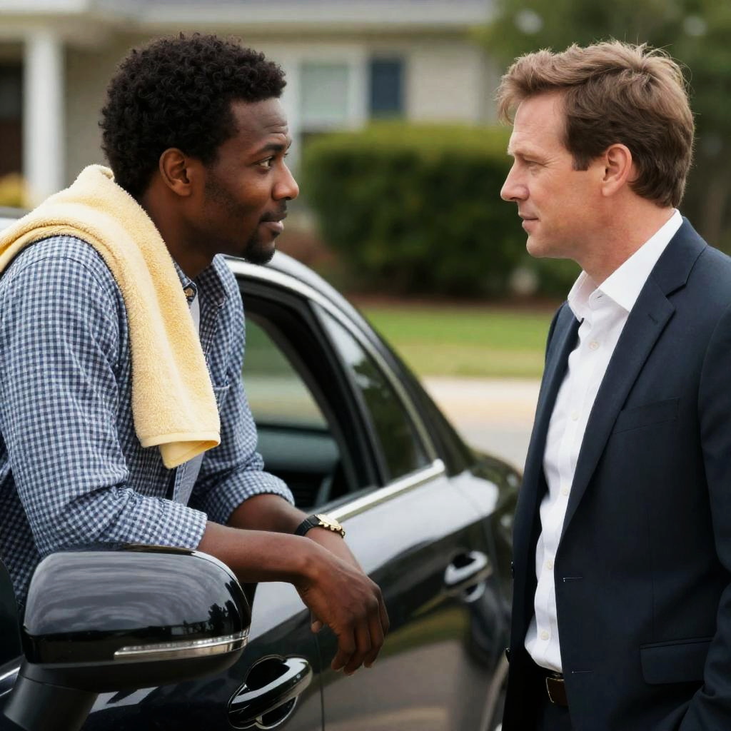 Photograph of two men outdoors. Black man with short hair, brown shirt, and brown overalls, gesturing with outstretched hands. White man with dark hair, red shirt, standing with hands on hips. Blurred grassy background. Black man's intense expression, white man's neutral expression. Both looking at each other.