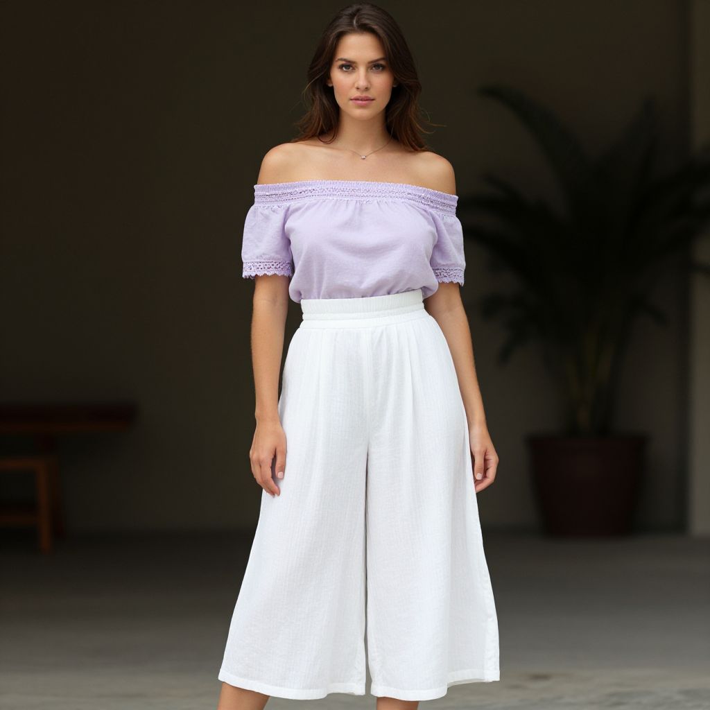 "Off-the-shoulder top, lightweight cotton, soft lavender, delicate lace trim, high-waisted culottes, flowy linen, crisp white, wide-leg silhouette, subtle pleats, casual elegance.. Sexy. Pretty face and beаutiful eyes. Big breasts."