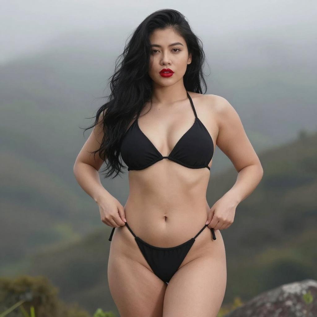 Photograph of a curvy woman with fair skin and dark hair in a ponytail, wearing a bright pink bikini. She stands waist-deep in a calm, natural pond, with green trees and mountains in the background. She smiles softly, her right hand resting on a rock. The sunlight filters through the leaves, casting gentle shadows.
