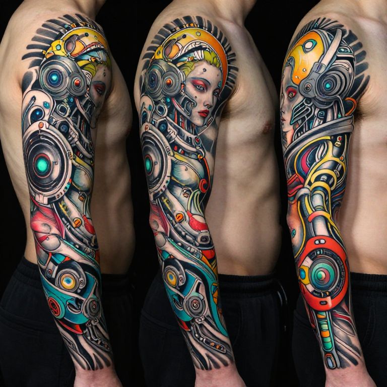 Concept art tattoos depicting surreal futuristic designs blending mechanical and organic elements, intricate line work, bold contrasts, vibrant colors, to be inked on a full sleeve, inspired by cyberpunk and biomechanical themes
