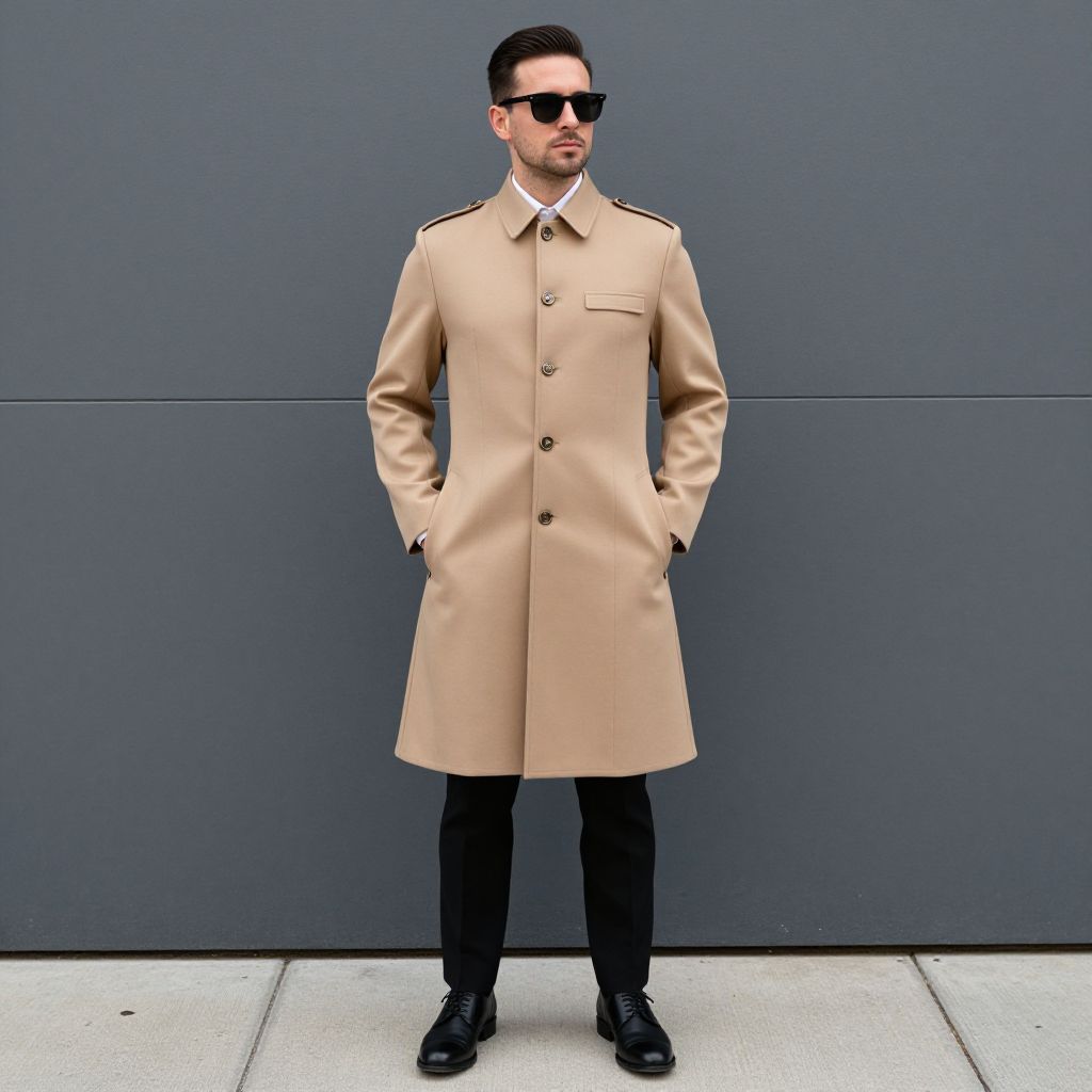 "Slip Costume, man in a tan dress standing with his hands in his pockets"