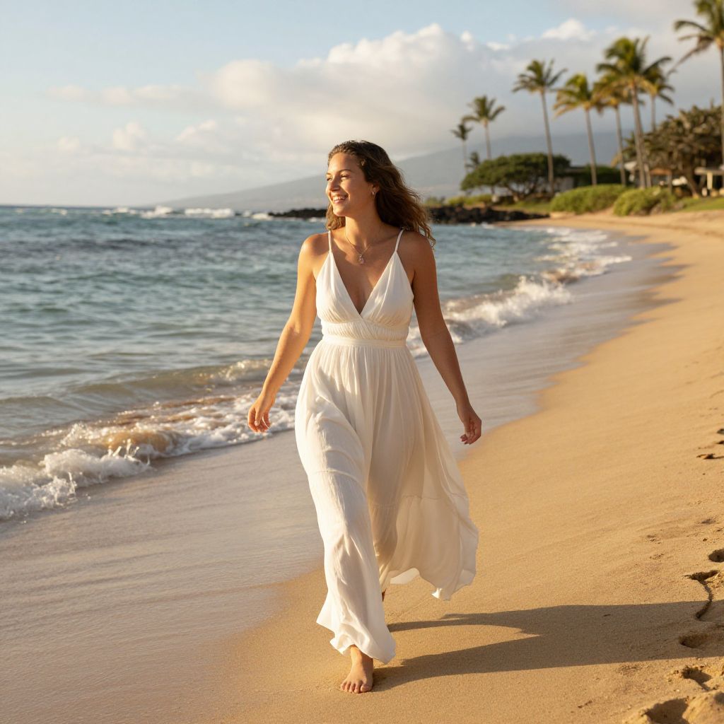 Radiant woman in a flowing white dress strides joyfully along the golden shoreline of Maui, her laughter mingling with the gentle waves and palm-fringed horizon.