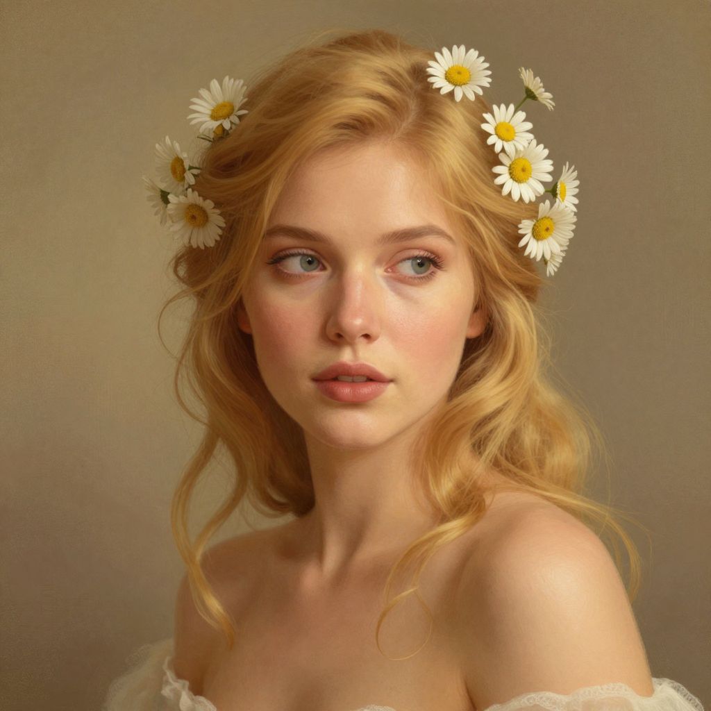 Photorealistic digital portrait of a young, fair-skinned woman with wavy, shoulder-length blonde hair adorned with white daisies. She has light blue eyes, a slender build, and a neutral expression. She wears an off-the-shoulder, white lace top. The background is a soft, beige gradient, creating a warm, ethereal ambiance. The lighting highlights her delicate features and the texture of her hair and lace. The overall style is reminiscent of classical beauty portraits with a modern, digital twist.
