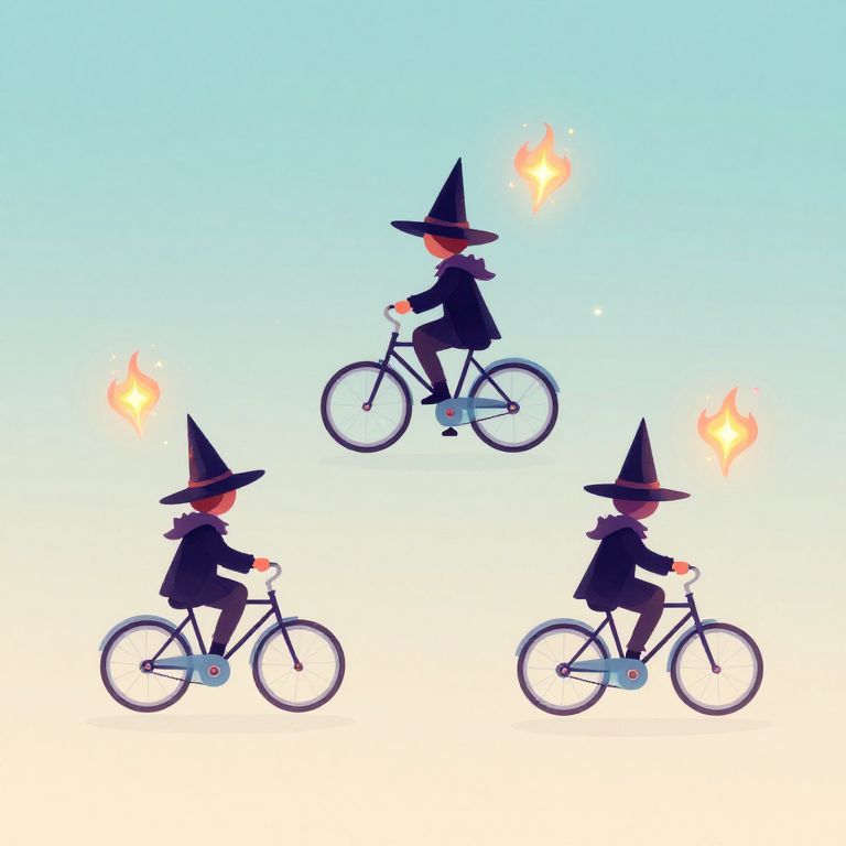 In a whimsical vector art illustration, three tiny wizards clad in pointed hats ride transparent bicycles that hover at varying heights, casting magical spells with fiery and sparkling effects that seem to defy gravity against a serene, gradient background.