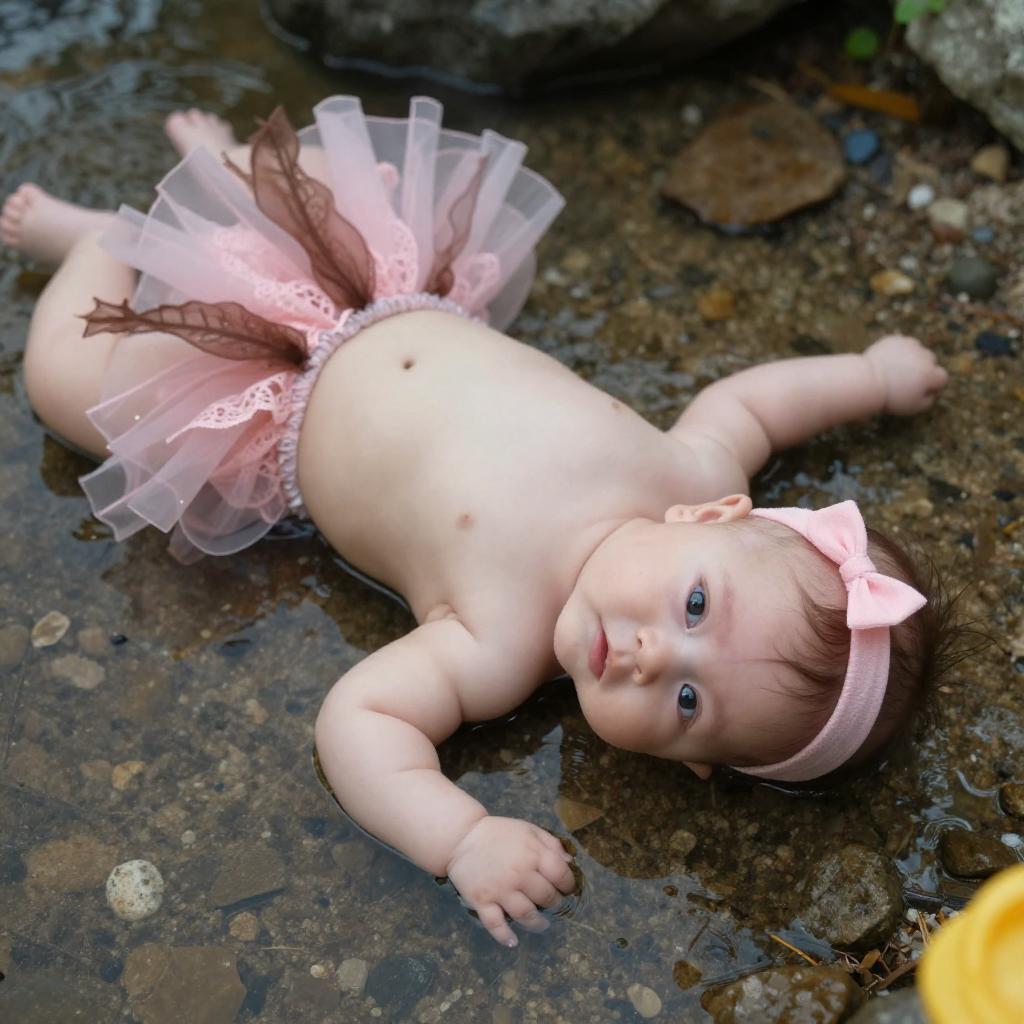 Photograph of a baby with light skin and brown hair, lying on a rocky, pebbly surface in shallow water. The baby is wearing a pink, lacey tutu with brown and pink tulle, and a matching pink headband. The camera angle is top-down, with soft, natural lighting. The background is slightly blurred, focusing on the baby. Depth of field is shallow, highlighting the baby's face and attire. A yellow hand is partially visible in the bottom right corner.