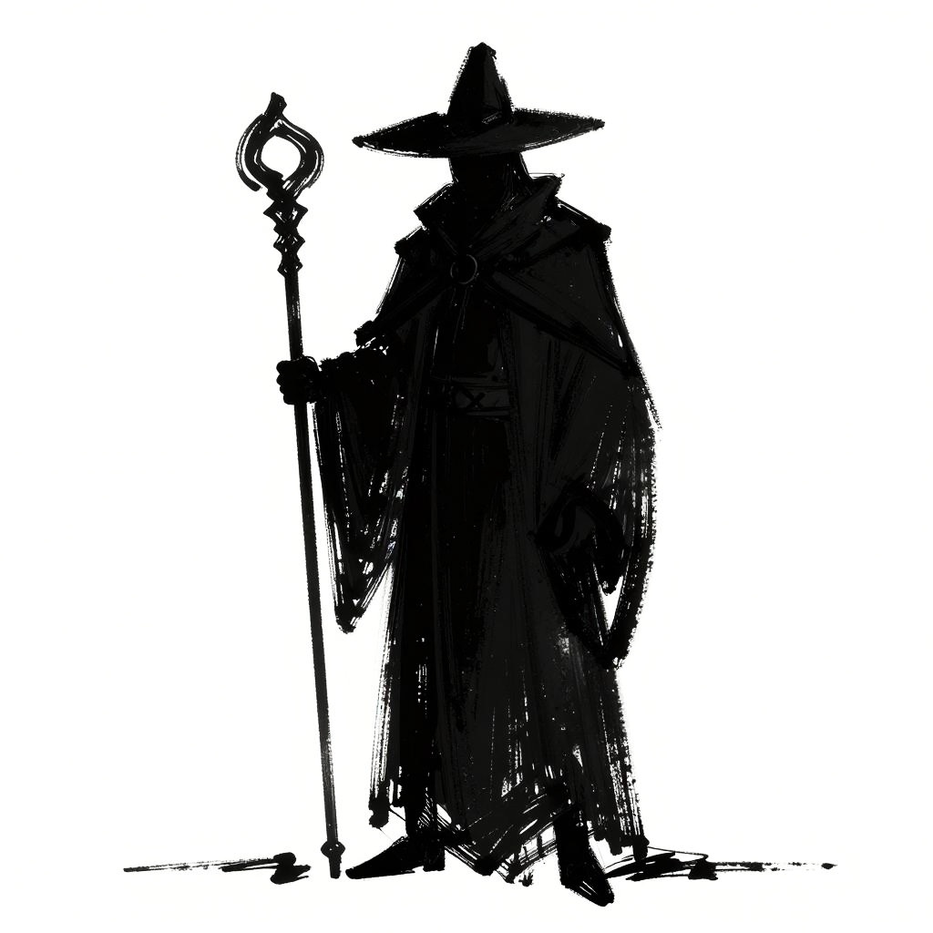 This is a digital drawing of a mysterious, black-robed figure with a wide-brimmed hat and a long, flowing cloak. The figure is standing with a staff in each hand, and the entire image is rendered in bold, black brushstrokes against a stark white background. The style is minimalist and abstract, with a focus on strong contrasts and dynamic lines.