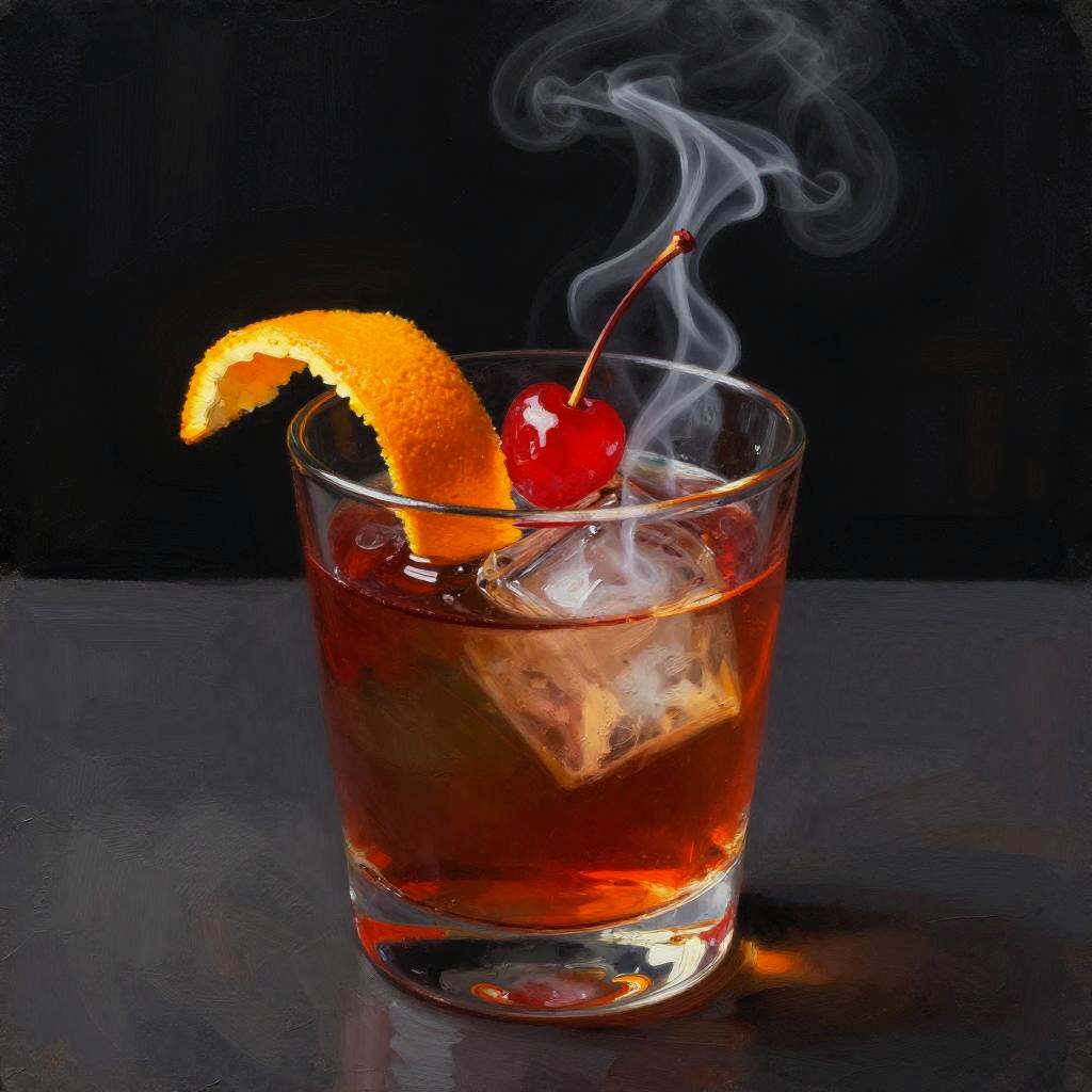 An illustration of a smoky Boulevardier cocktail, garnished with flamed orange twist and Luxardo cherry, featuring a chiaroscuro oil painting aesthetic, highly detailed, true color, sharp contrast, vivid background.