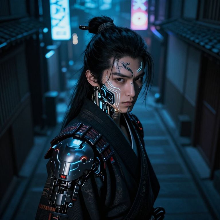 A striking portrait of a cyberpunk samurai warrior merges traditional Japanese aesthetics with futuristic technology, as glowing neon lines intricately tattoo the character's face and body. The scene unfolds in a dimly lit alleyway, illuminated by distant holographic advertisements casting an ethereal blue glow and dramatic shadows on the walls. From an elevated perspective above the character's shoulder, this image invites viewers into a world where ancient warrior codes meet advanced cybernetic enhancements, challenging our understanding of time-honored traditions and modern innovation while maintaining an atmosphere of mystique and danger.