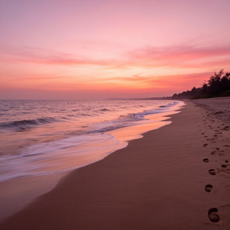 Photograph of a serene beach at sunset. The sky is a gradient of pink, orange, and purple hues, reflecting on the calm ocean waves. Gentle waves lap against the sandy shore, which is dotted with small, dark footprints on the right. In the background, a silhouette of trees lines the horizon. The sand is smooth and slightly wet near the water's edge. The overall atmosphere is peaceful and picturesque, with soft, warm colors dominating the scene.