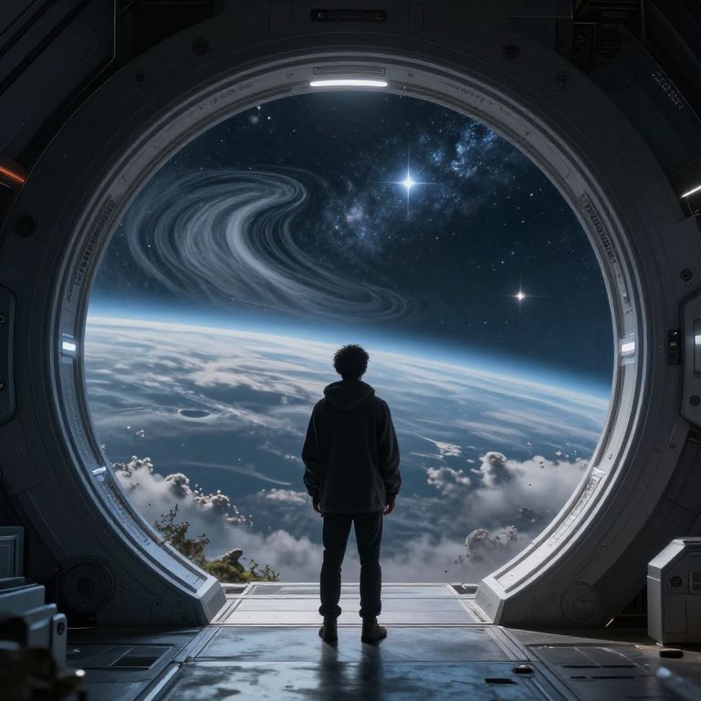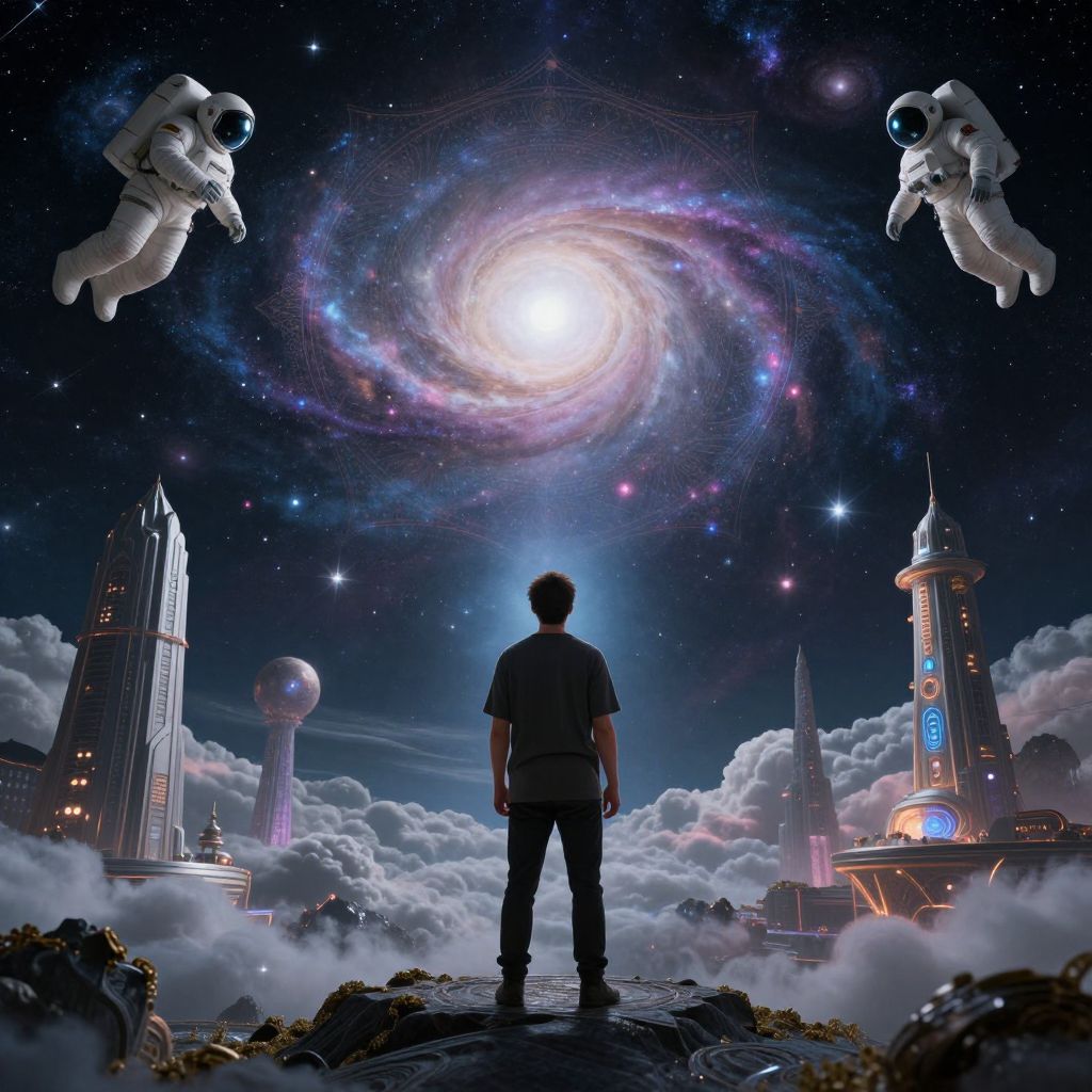 A beautiful photorealistic render of a man gazing into galaxies, ancient astronauts, ornate calendar of the soul, and shooting stars, clouds, futuristic structures, mandalas, artificial intelligence seeding humanity, miraculous, spiritual science, divinity, utopian, heaven on earth by lisa frank, david a. hardy, wpa, public works
