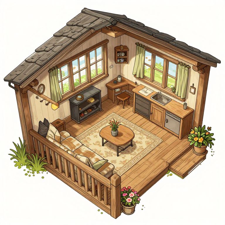 This is a digital, isometric drawing of a cozy, small wooden cabin. The cabin features a pitched roof with dark shingles, and large windows with green curtains. Inside, a beige sofa with patterned cushions faces a round wooden coffee table with a small potted plant. A wooden dining table and chair set is beside a stove and sink, with a shelf above holding dishes. A rug with a floral pattern covers the wooden floor. Potted plants sit on the floor and a small railing surrounds the porch, which has grass growing at its base. The style is colorful and cartoonish.