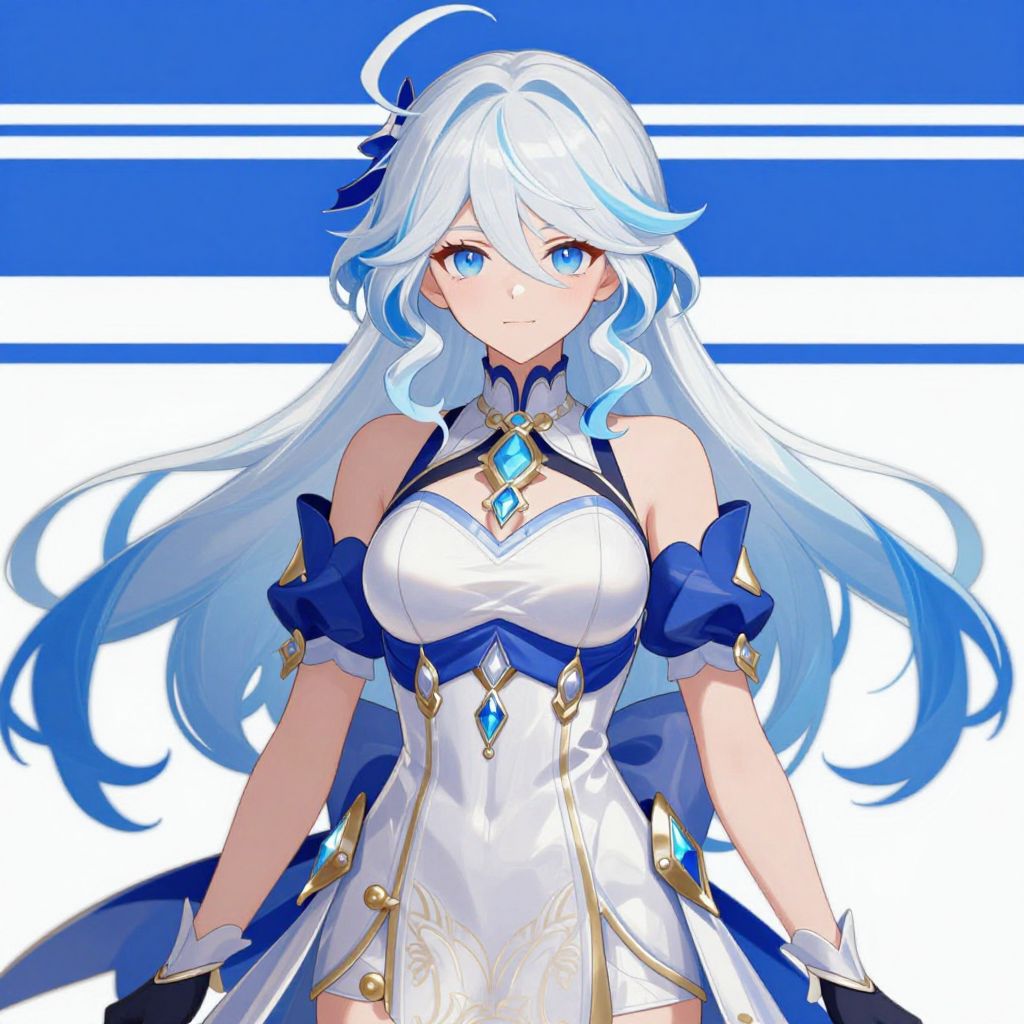 This digital anime-style drawing features a blue-eyed, fair-skinned woman with long, flowing white hair and a small blue ribbon. She wears a white, sleeveless dress with blue and gold accents, including a diamond-shaped blue gem on her chest and matching gems on her shoulders and waist. Her dress has puffed blue sleeves and a high collar. The background is a simple white with blue horizontal stripes. The woman's expression is calm and slightly shy, and her hair has a soft, wavy texture. The artwork is colorful and vibrant, with a focus on the character's detailed attire and gentle features.