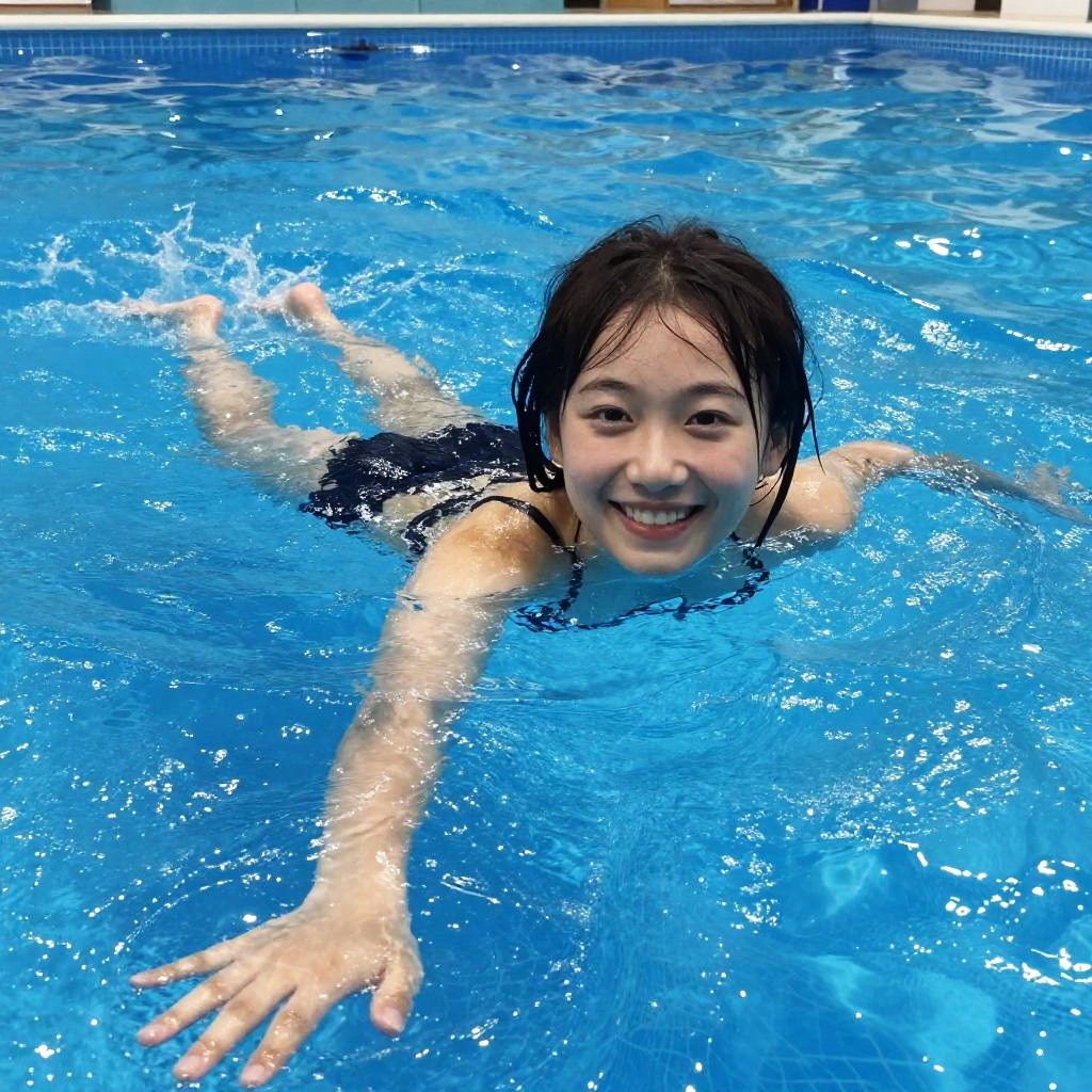 Photograph of a young woman with wet, dark brown hair, smiling widely while swimming in a bright blue pool. She's partially submerged, with her head and shoulders above water, and her right arm extended forward. The water has a sparkling, clear texture, and the overall image has a vivid, almost over-saturated color effect. She has fair skin and appears to be enjoying herself.
