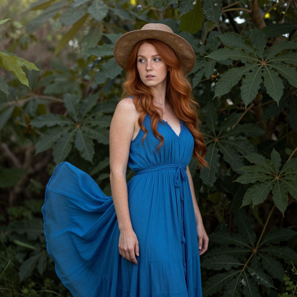 Photograph of a red-haired woman in a flowing blue dress and straw hat, standing amidst lush green foliage, with her dress gently billowing.