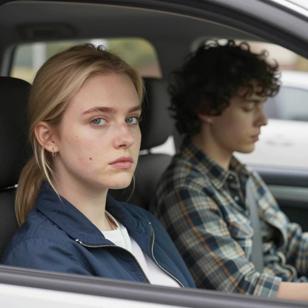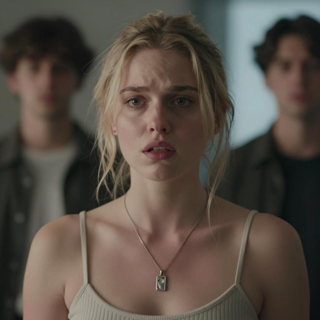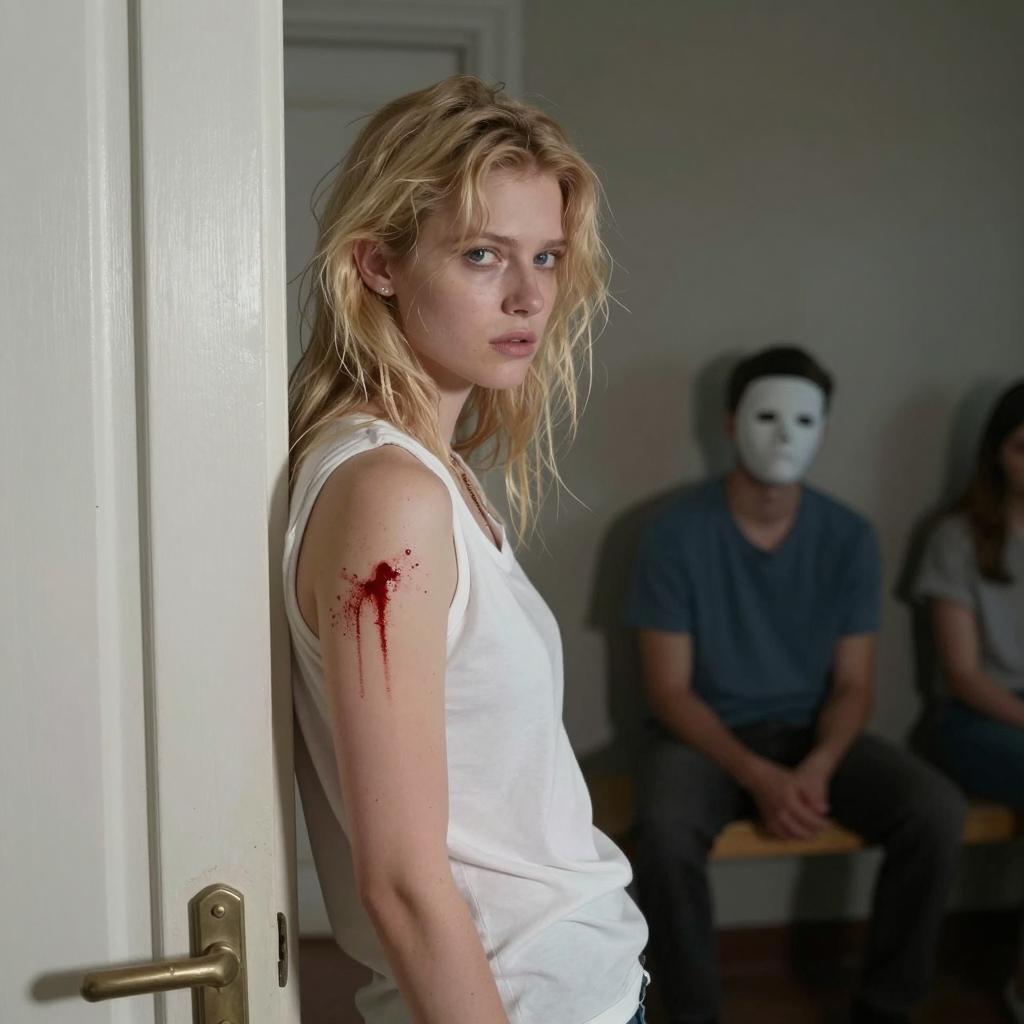 Woman with disheveled blonde hair, blood on right arm, leaning against white door, wearing sleeveless white shirt. Background: man with white mask, blue shirt, sitting on wooden bench. Dimly lit room. Shadows on walls. Two people.