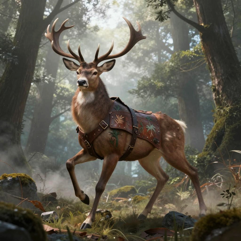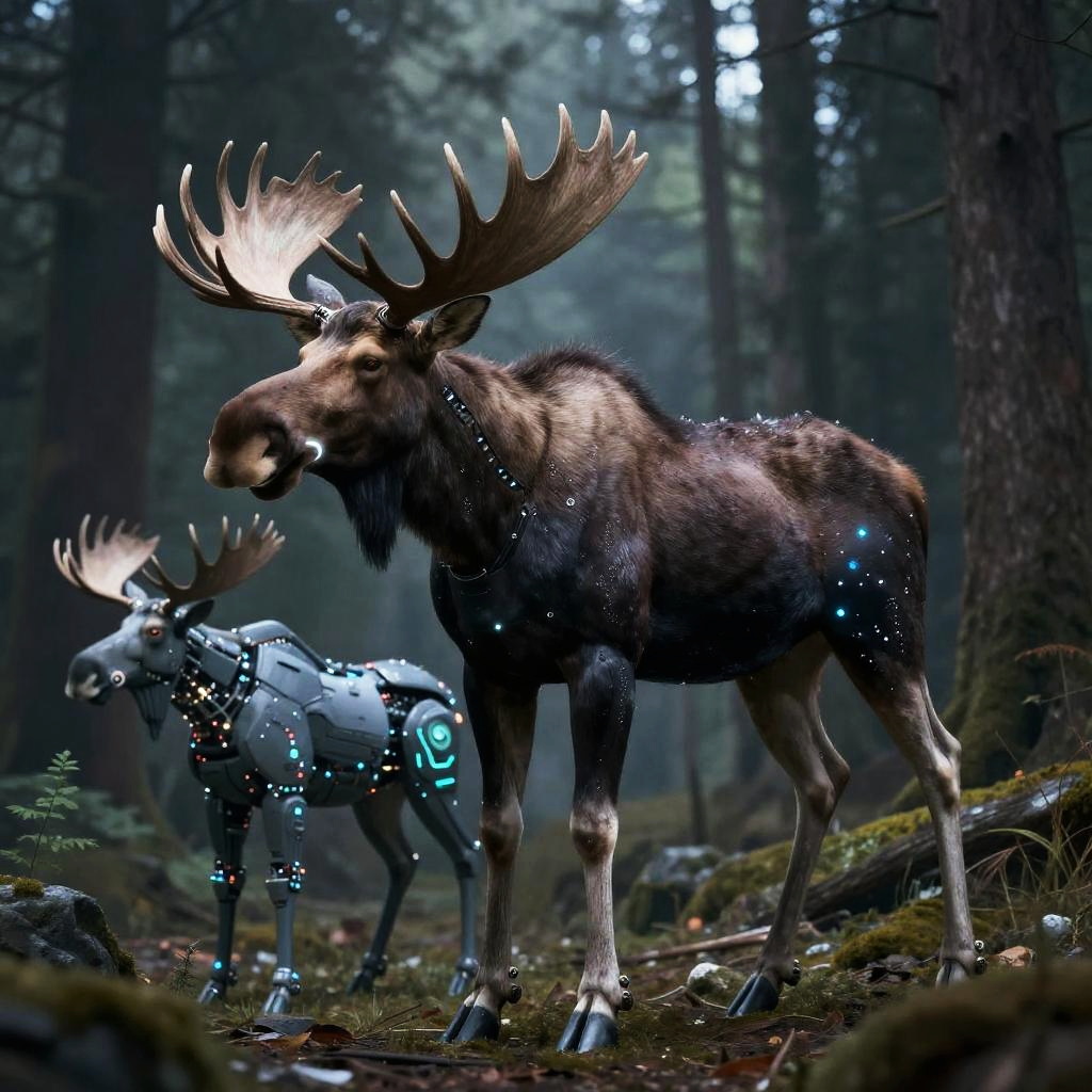 Highly detailed post-cybernetic tundra scene, hyper-realistic 4K rendering, volumetric lighting, frozen wasteland with digitized frost overlay backdrop, mechanical elk with fiber-optic antlers and circuit-laced fur, cool-toned serene cold atmosphere, detailed fur with lifelike textures, cyberpunk aesthetic.